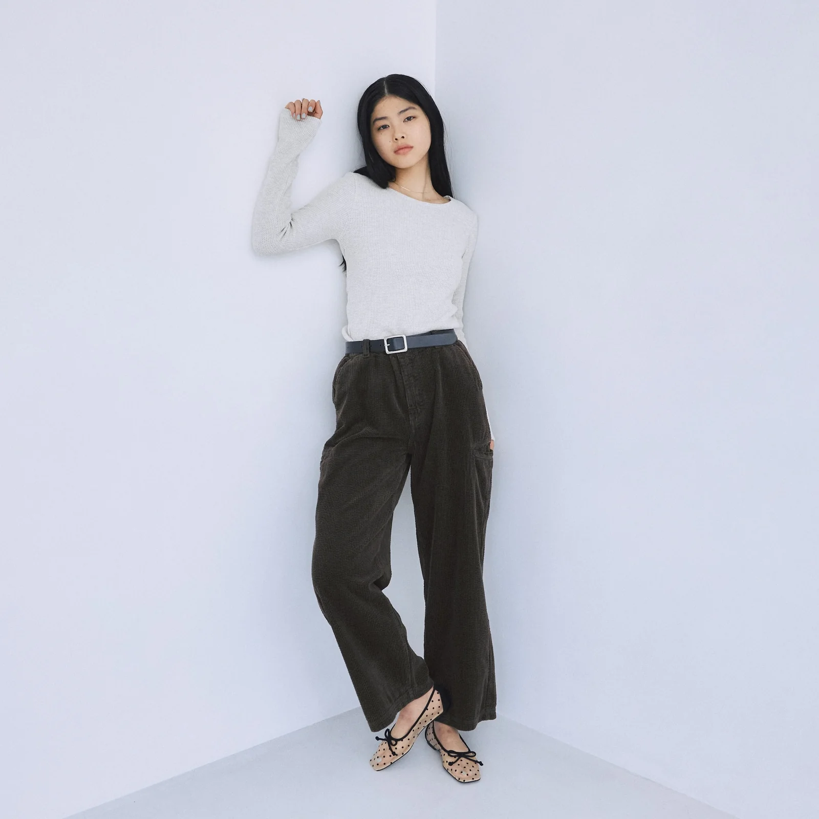 カーブベルトで腰周りをしっかりフィットさせつつ、ゆったり落ちるワイドラインで今っぽいルーズな表情を楽しめます。