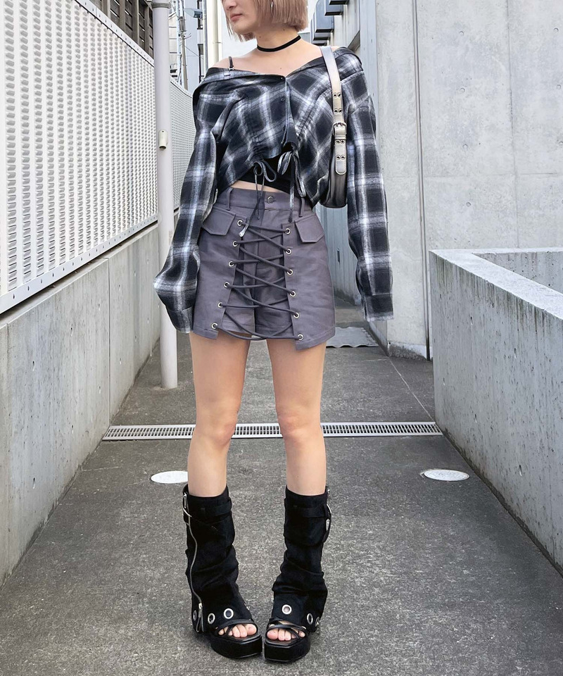 センターフロントのレースアップがセクシーなショートパンツ。