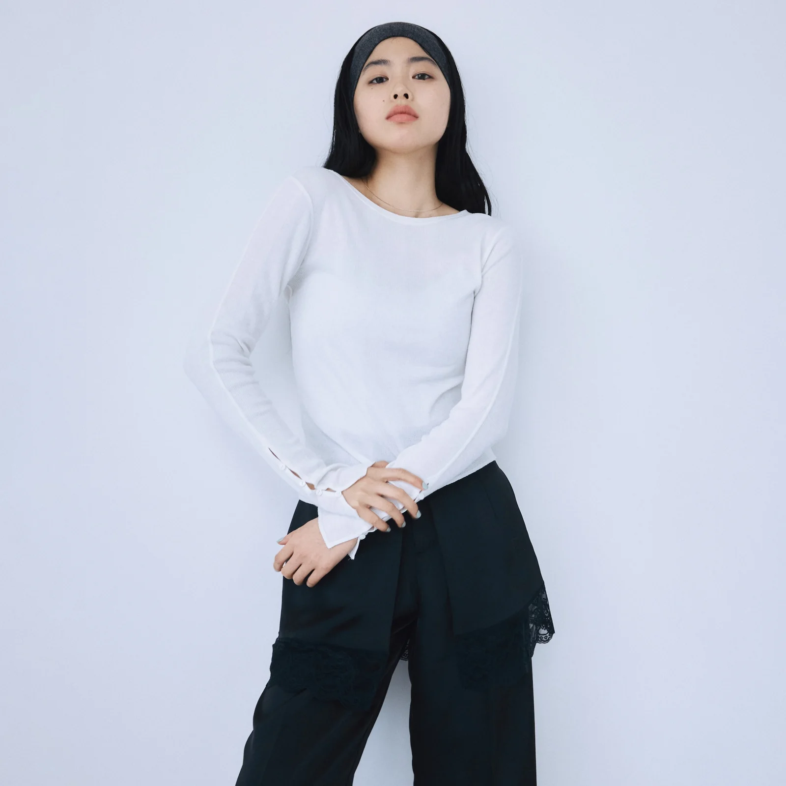 コットン100%のオリジナルSoft sheerランダムRIB生地を用いたタイトトップス。