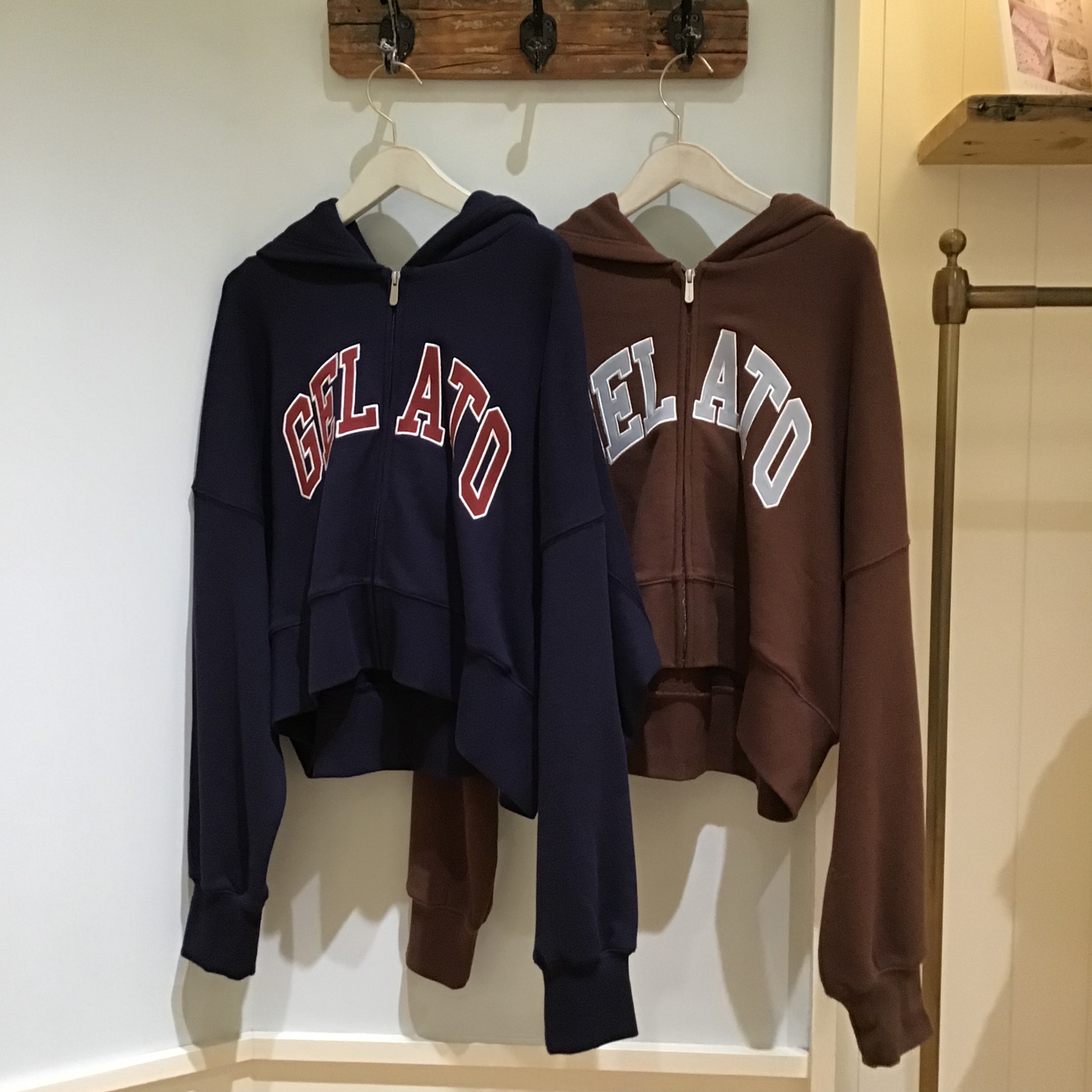 ボリューミーな袖と、腰回りを包むようなゆとりのあるシルエットが今っぽいショート丈のジップパーカ。