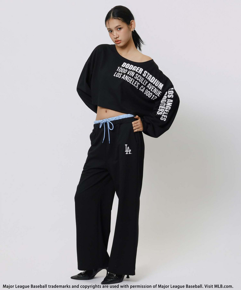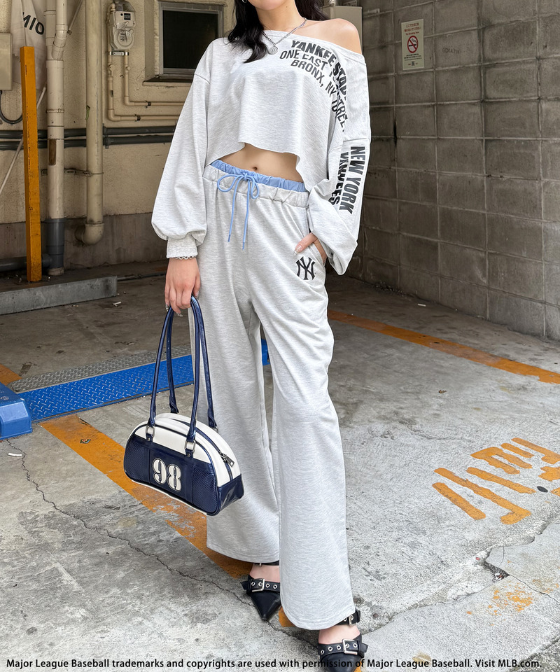 トレンド感あふれるオフショルダー仕様のトップスと、脚を長く見せるルーズなパンツを組み合わせた注目のセットアップ。