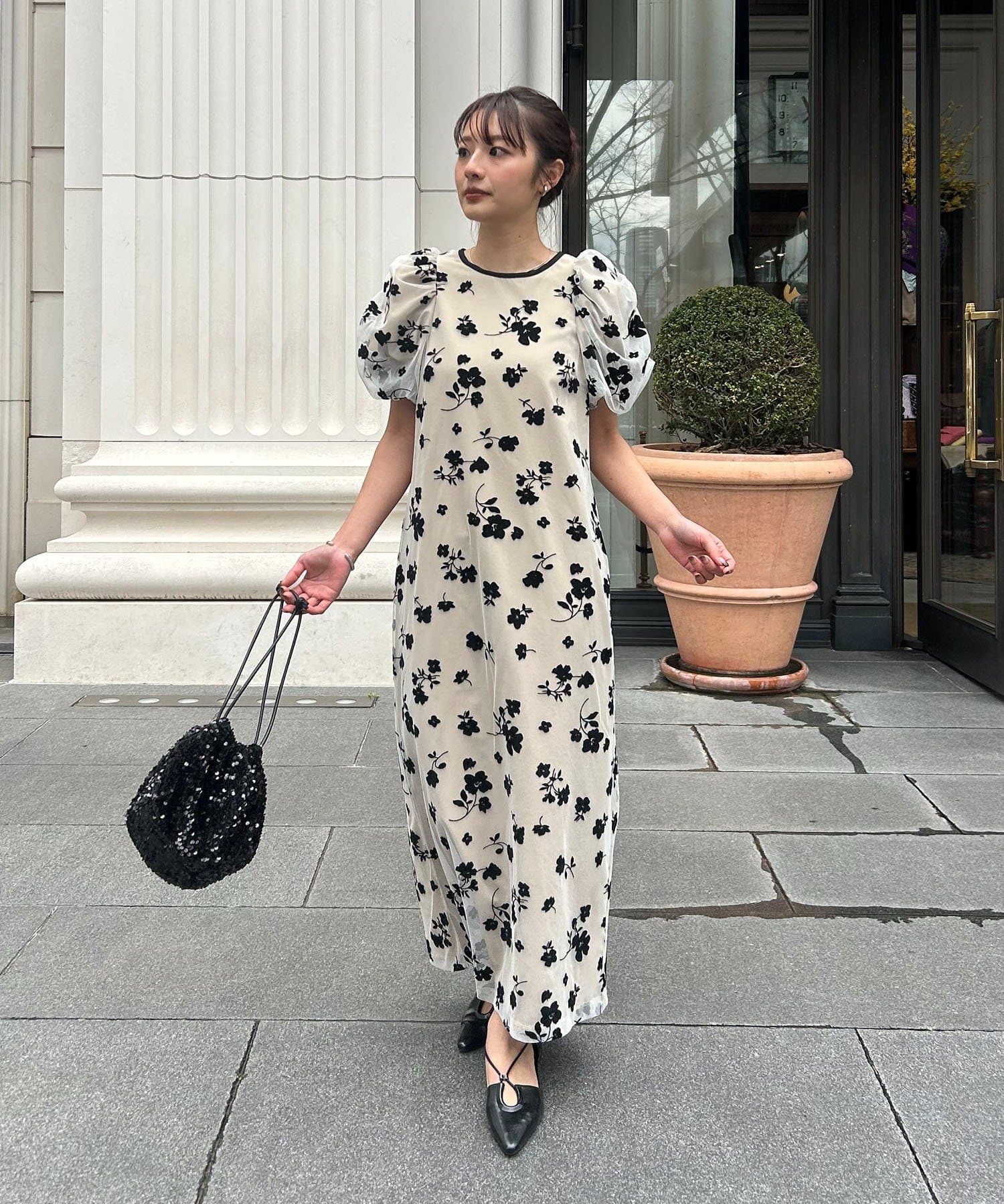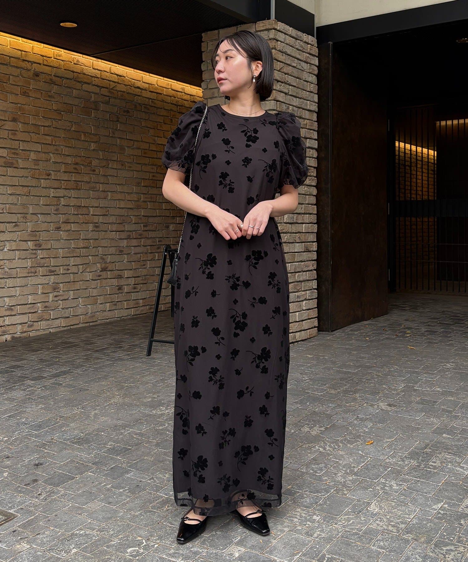 ブラックでも花柄とお袖のパフで可愛らしい印象に◎