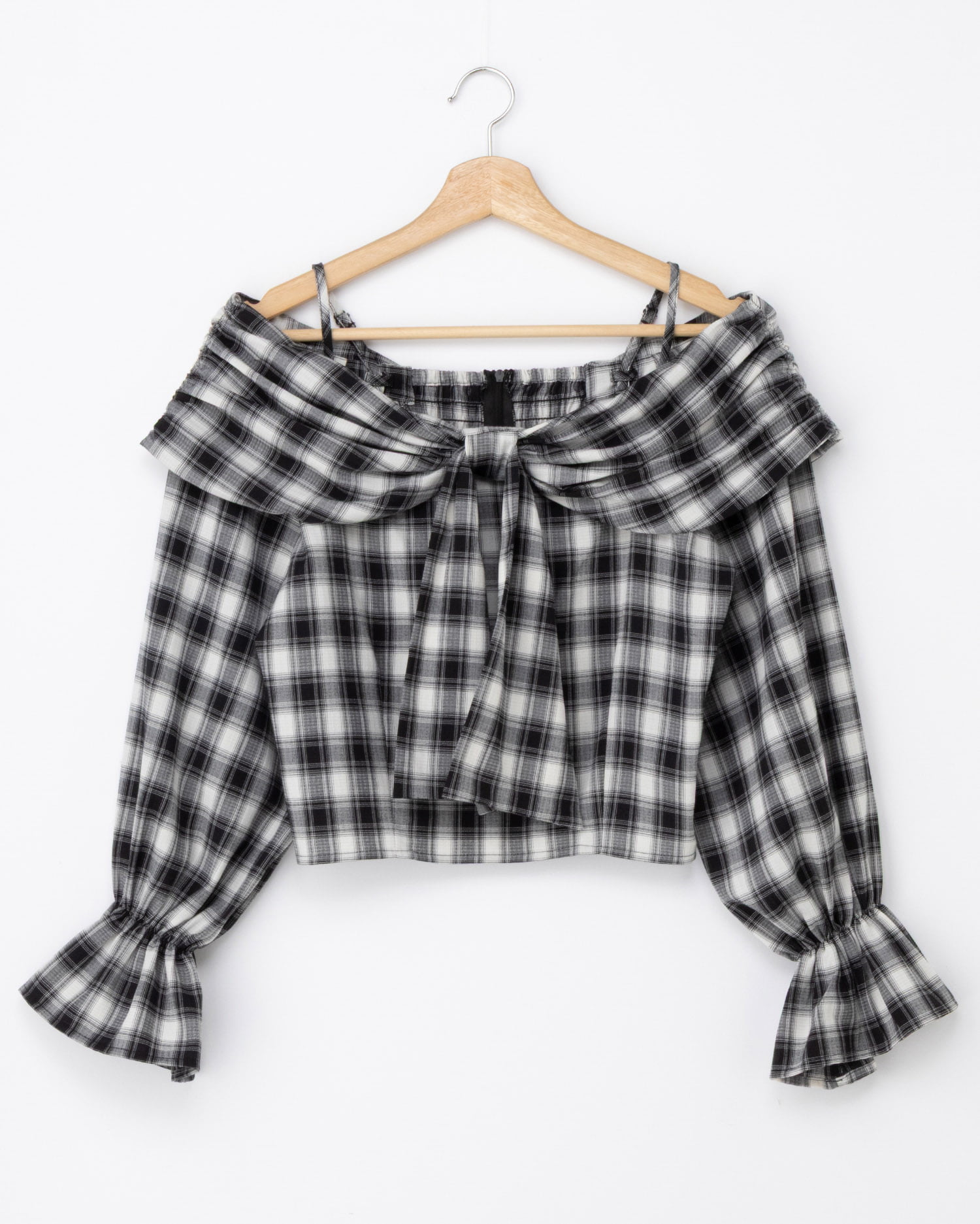 リボンオフショルチェック柄ブラウス
