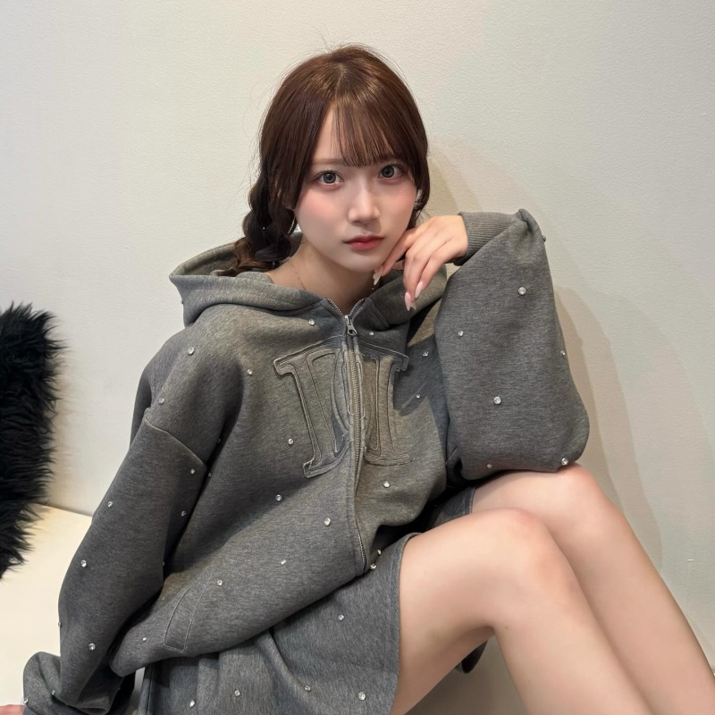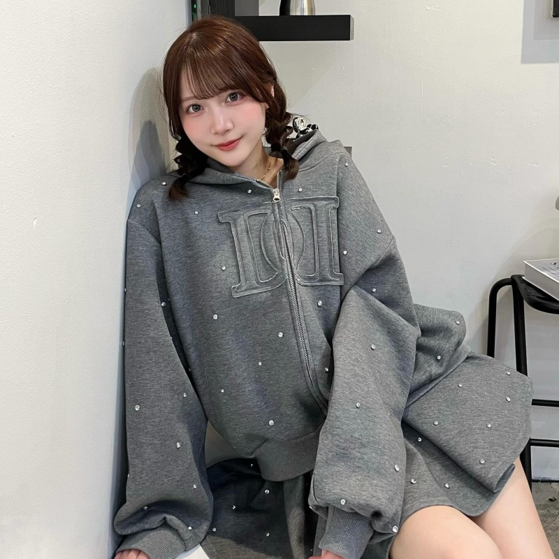 フロントのDDロゴ刺繍と全体に散りばめたビジューが目を惹く、華やかスウェットセットアップ♡