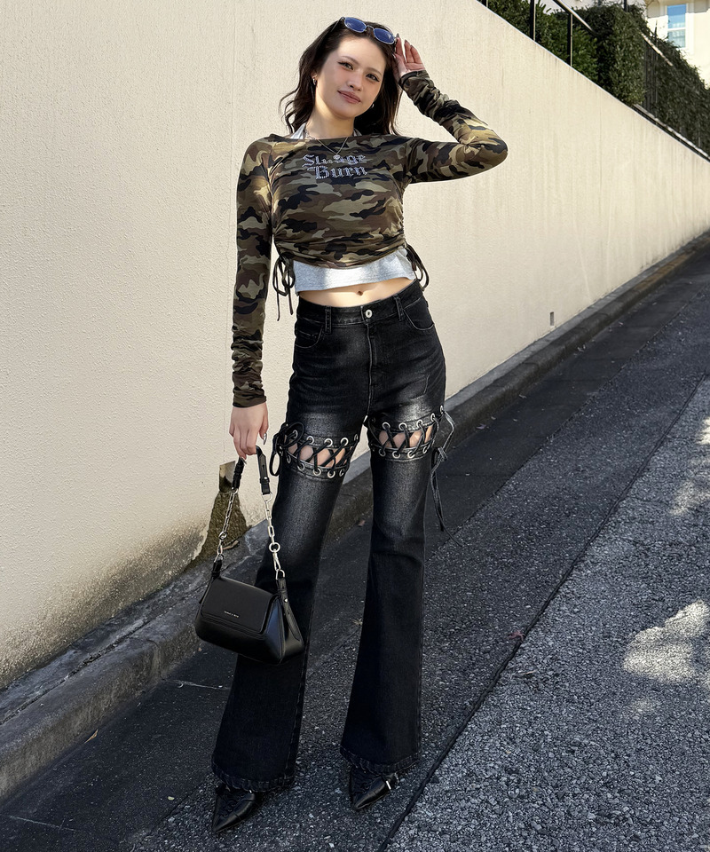 太もも部分にレースアップデザインを施したフレアパンツ。
