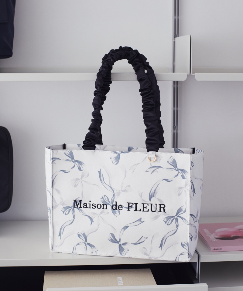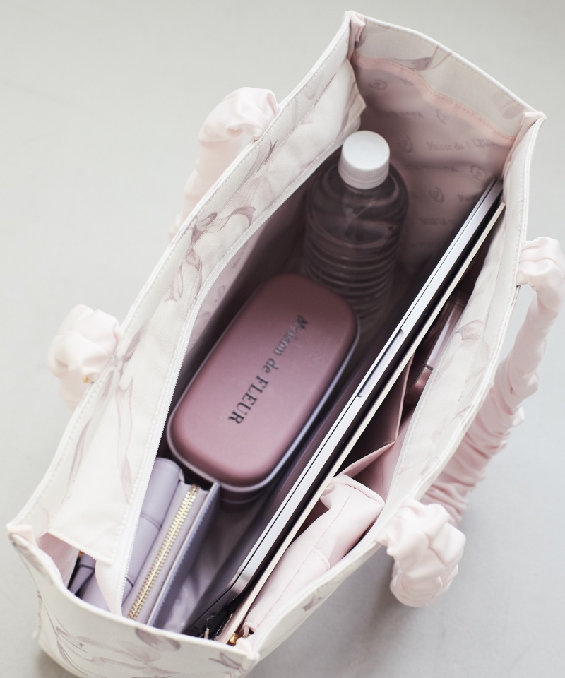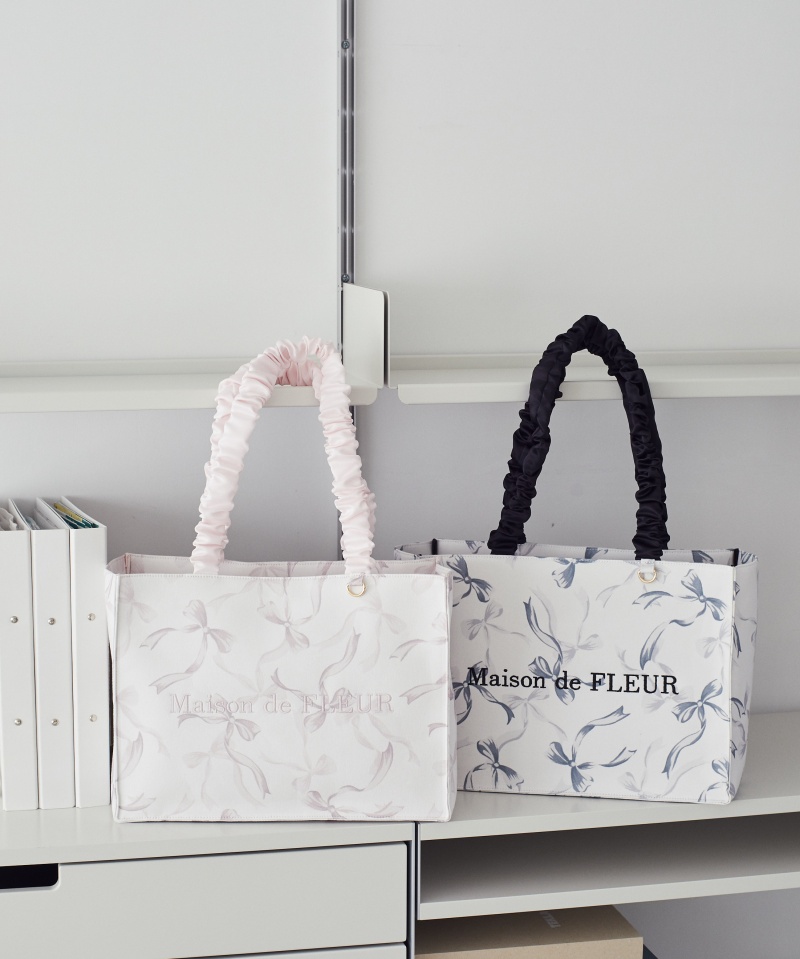 オリジナルのリボン柄がフェミニンな印象を与えるトートバッグ。