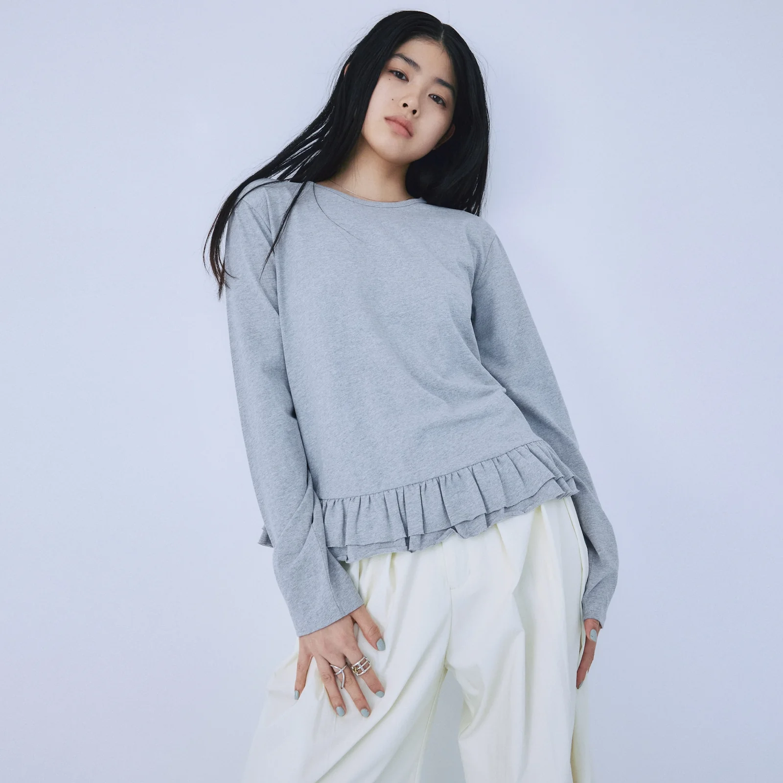 ゆったりとしたオーバーサイズに、あえて低い位置でフリルを切り替えた今どきのシルエット。