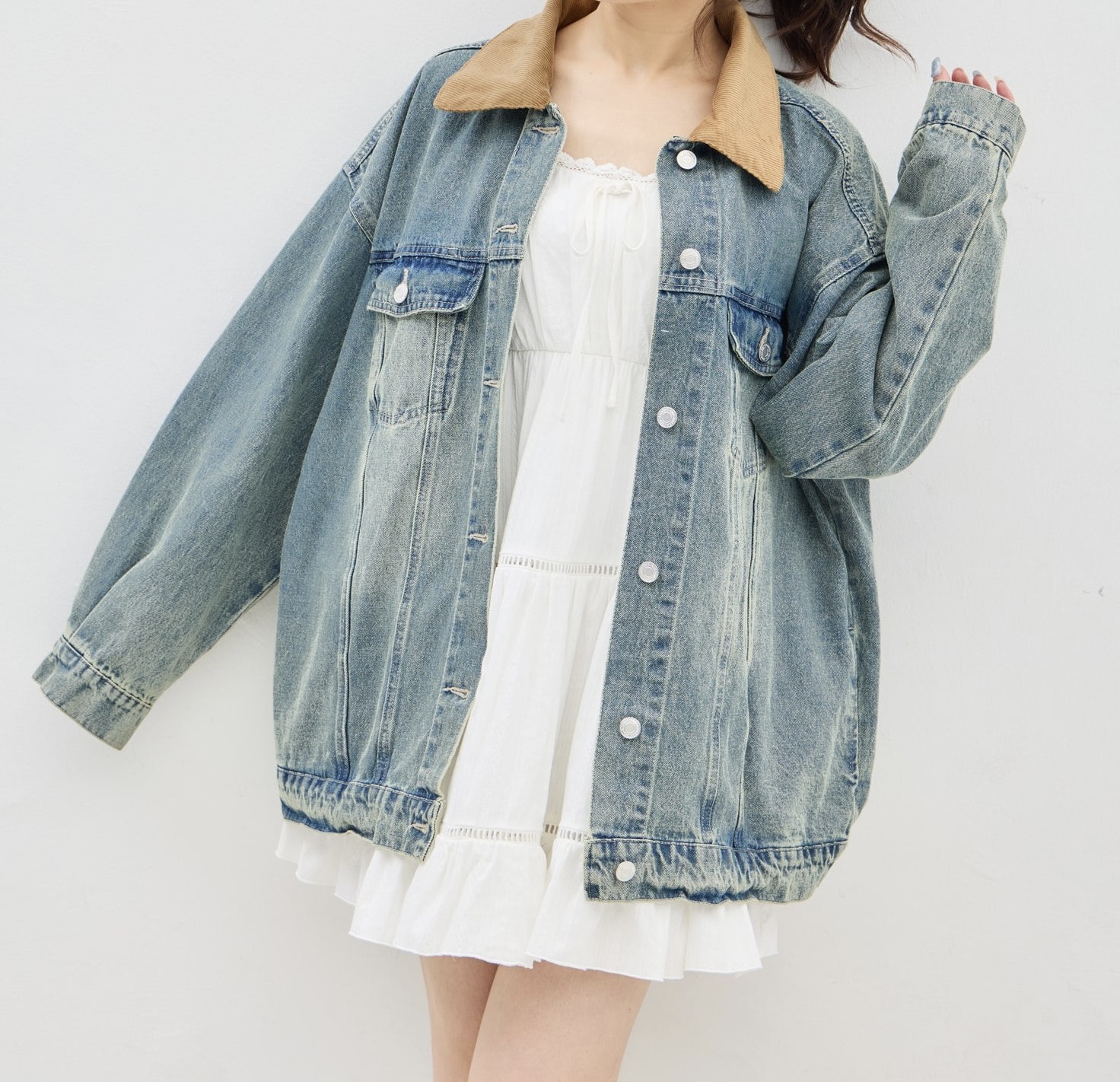 ほどよいオーバーサイズ感と取り外し可能なコーデュロイの異素材襟がポイントです👏🏻
