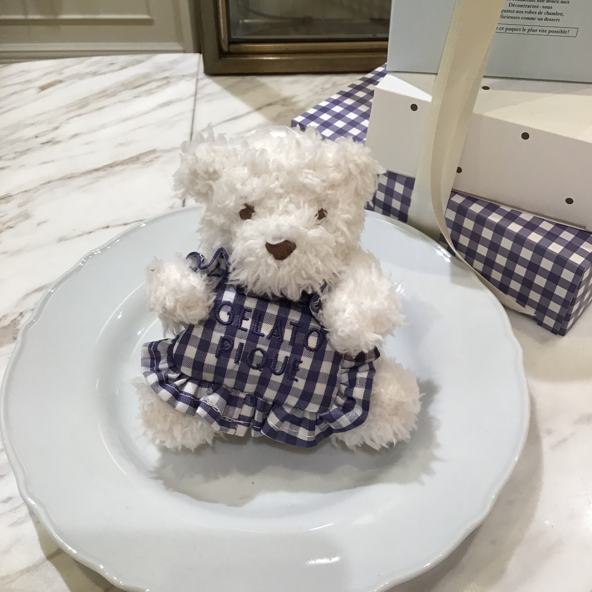 ギンガムチェック柄のフリル付きまくらを抱えたベアが愛らしい、ぬいぐるみチャームです💙まくらにはブランドロゴの刺繍も入ったキャッチーなデザインで、バッグのハンドル等に付けてお楽しみいただけます🎶🎶