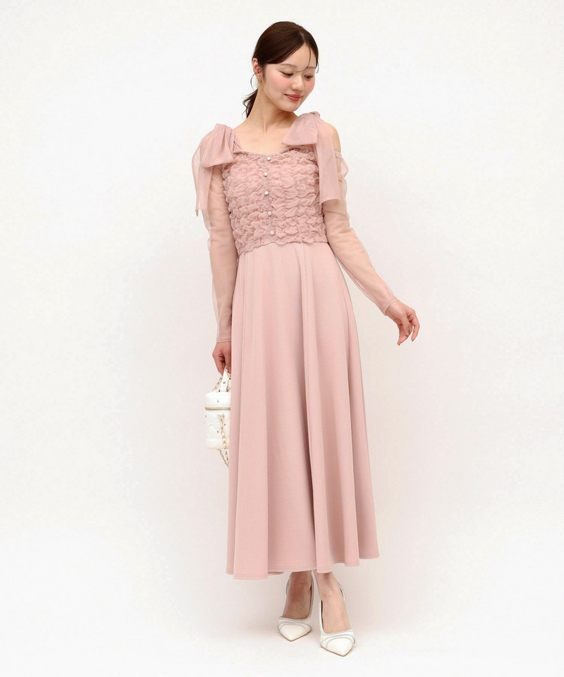 上身部分にはたっぷりとギャザーを寄せ表情をプラス、ショルダーリボンデザインもアクセントとなり目を惹くポイントです。