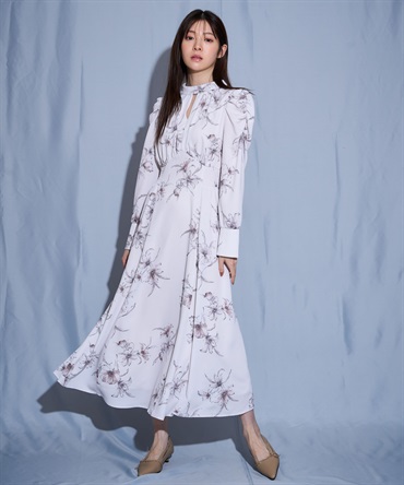 大柄ながら繊細なタッチのプリントが大人の華やかさを引き立て、高めのウエストから広がるシルエットでスタイルアップも叶えます。