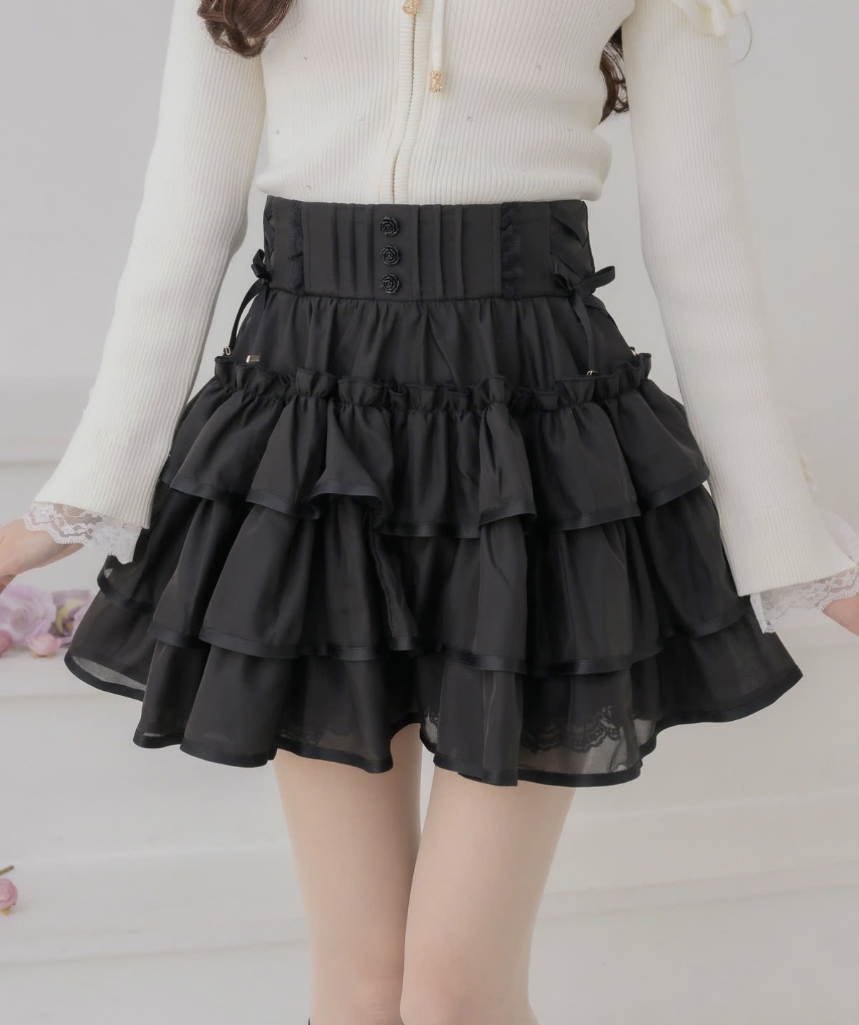 フリフリが愛らしい、ボリューム満点のミニスカパン♪バラ釦とサイドのレースアップリボンがさりげないアクセント◎チェック柄のピンクベージュはコーデの主役に、ブラックとホワイトは合わせやすいシンプルカラーです。