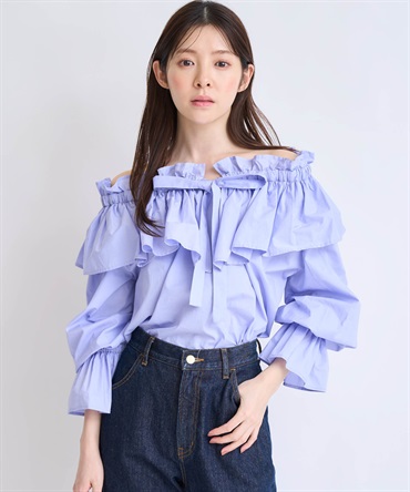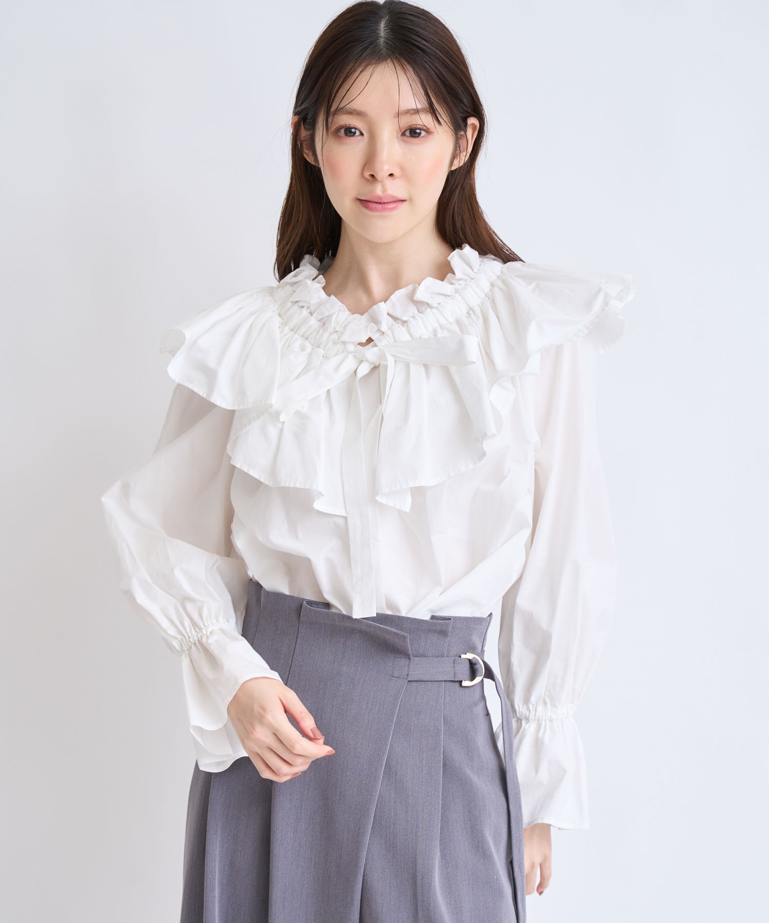 襟元と袖にあしらったフレアが、華やかで印象的なデザインブラウス。