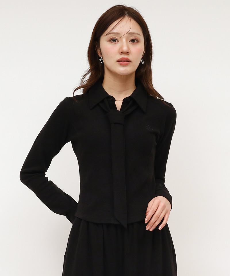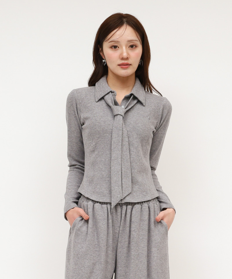 付属のタイは、ネクタイ風に結んだり首に巻いたりとアレンジが自在。