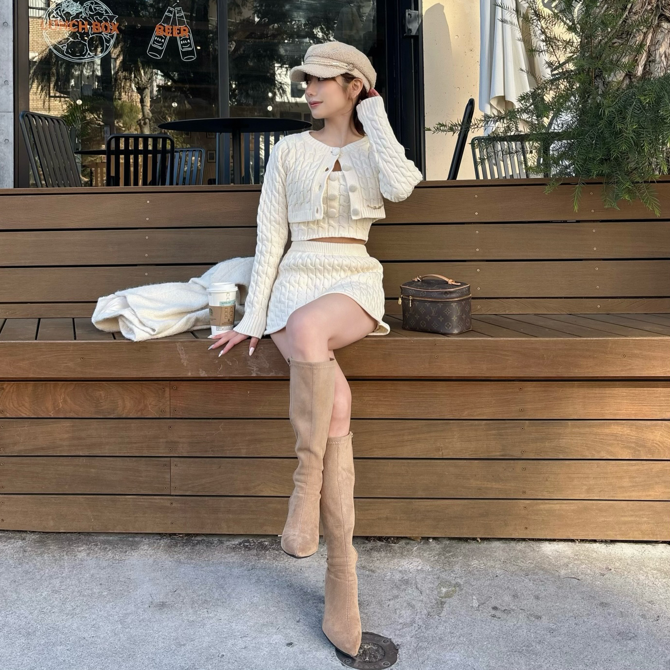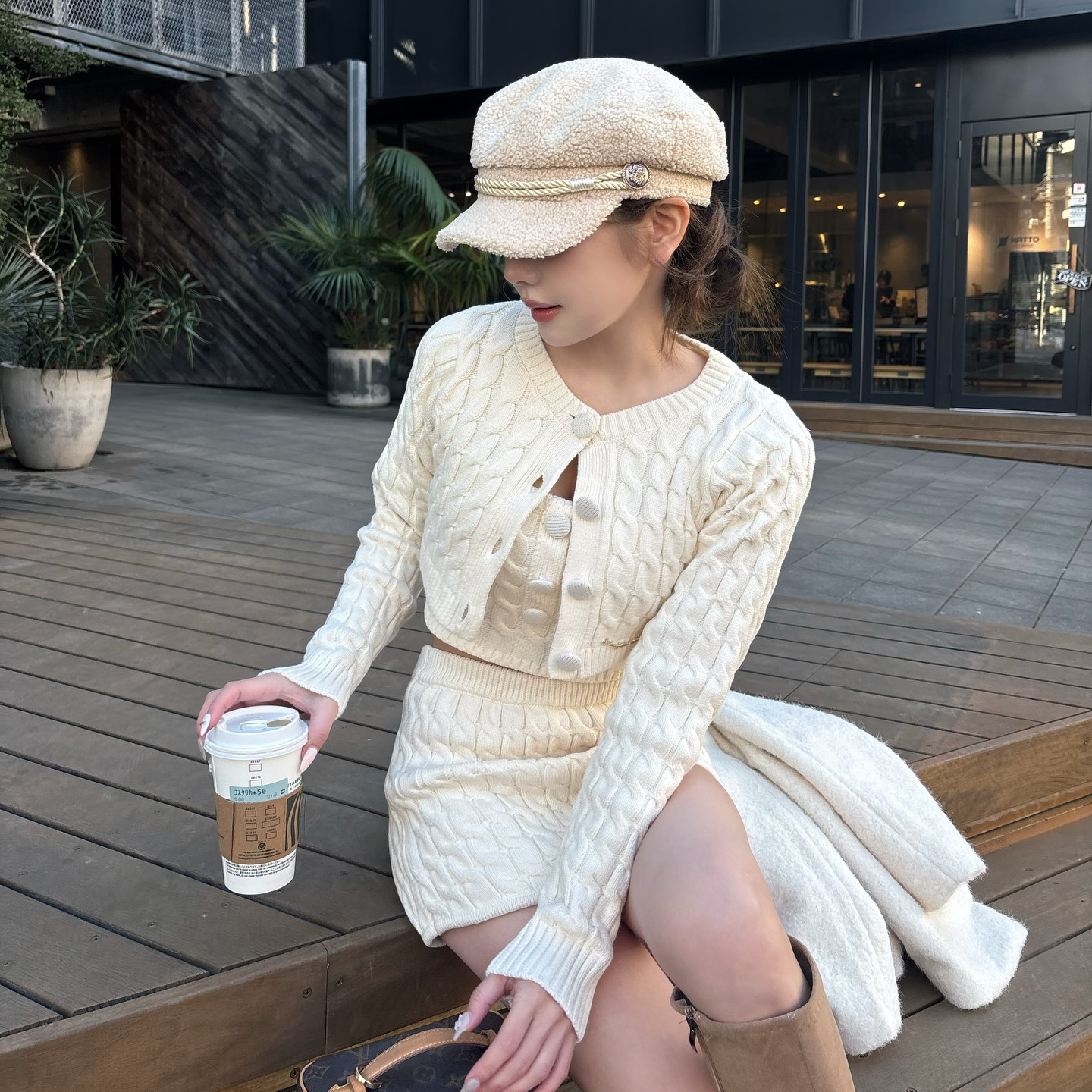 レトロなくるみボタンとケーブル編みが目を惹く、キャミ・カーディガン・ミニスカートの3ピースセット🧶🎀