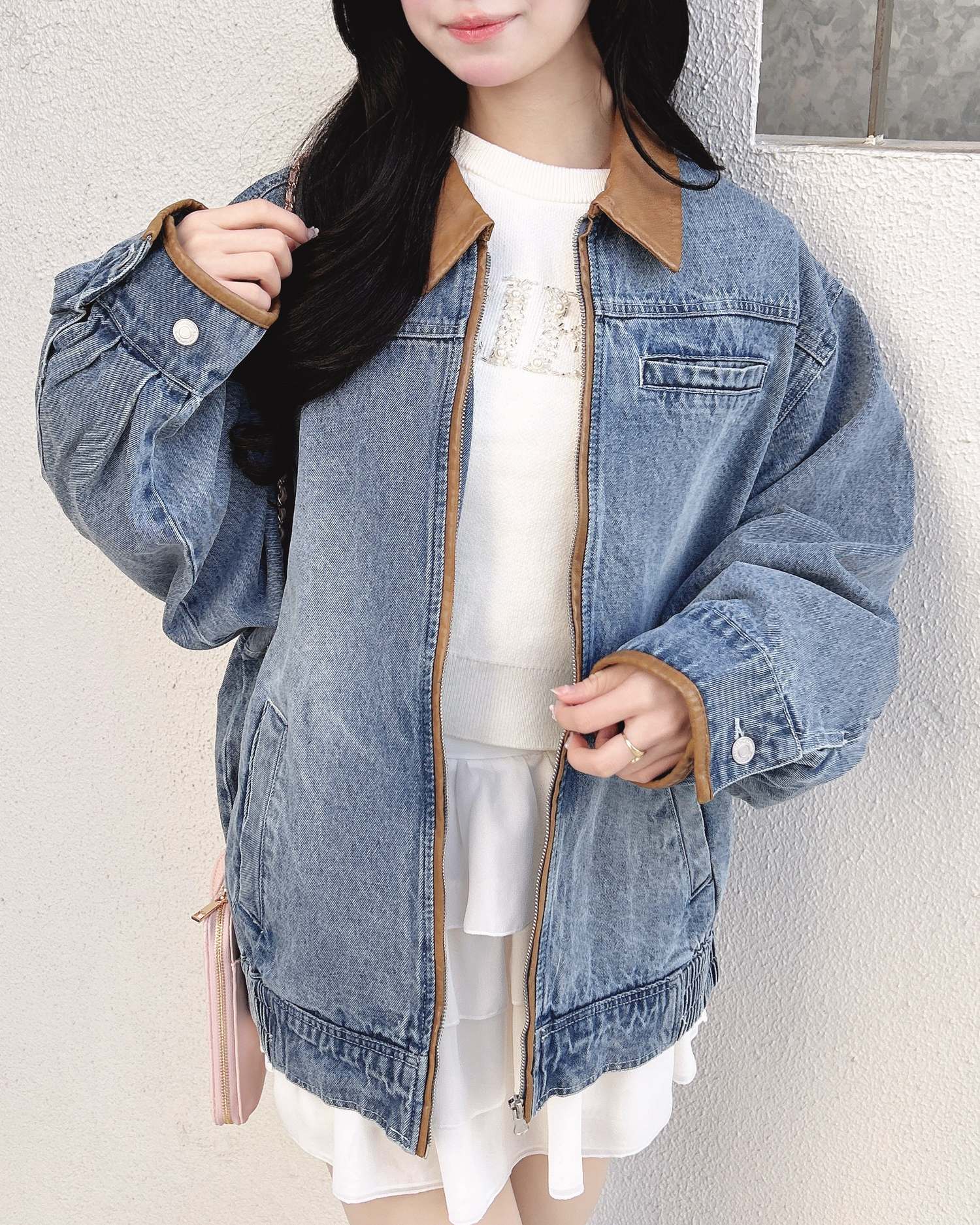 フェイクレザーで仕立てたバイカラーの襟とパイピングデザインが全体を引き締め、カジュアルすぎず上品な印象を与えてくれるアイテムです👍🏻🎶