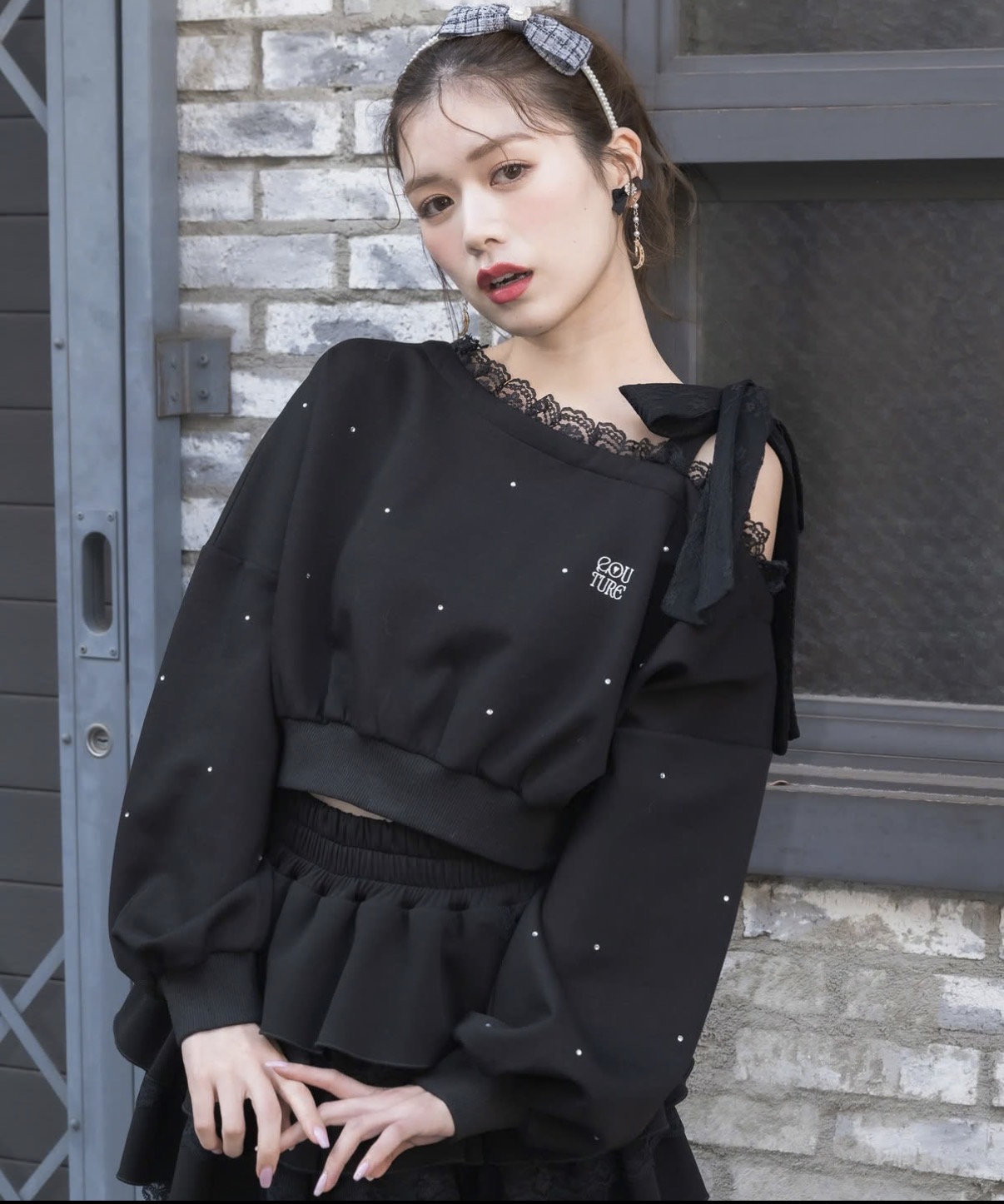 カジュアルだけどお洒落映えできるスウェットトップス。ランダムなストーンが全体的に施されていて光の具合でキラキラと表情をプラスします。ワンショルはインナーのストラップを隠しやすい幅感、レースリボンがお顔まわりの可愛いアクセントになってくれます。ボトムもスウェットアイテムと合わせるとセットアップ風に着用いただけます。