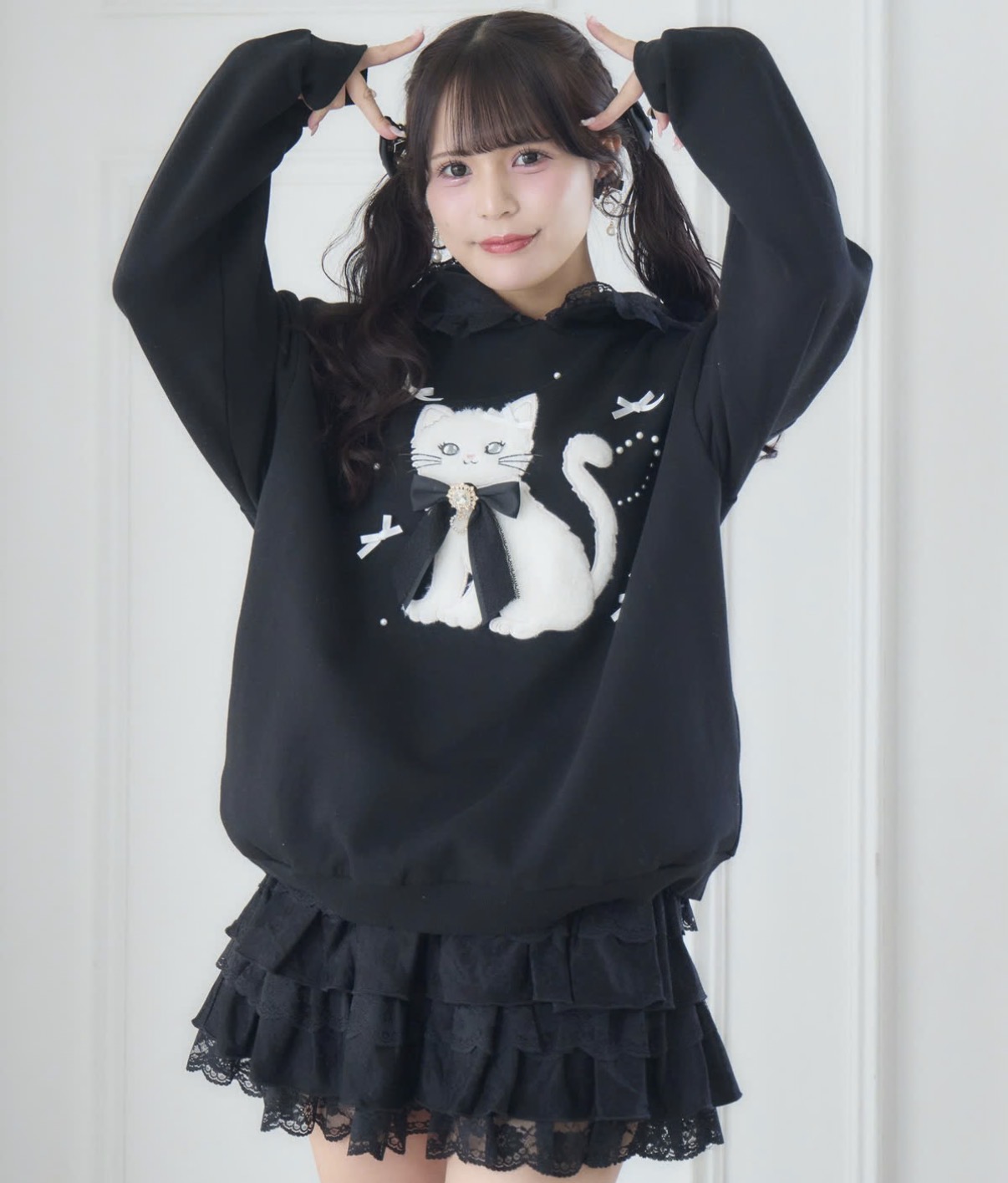 猫のアップリケが愛嬌を振り撒く♪尻尾がパールと合わせてハートの形になっているのがアピールポイント♡キャットの首元のリボンは取り外し可能なので、着ける位置を変えたり自由に遊んでOK。スウェットなので着心地も楽ちん。デイリー使いはもちろん、リラックスタイムにもぴったりな一枚です。