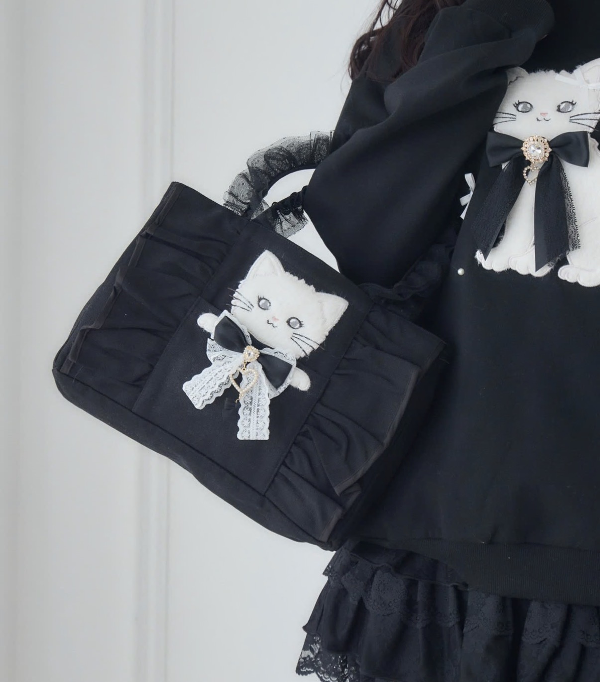 猫が外ポケットからひょっこり顔を出す、キュートなトートバッグ♡フリルをあしらったデザインで、可愛らしさをたっぷりプラスしました。リボンに付いたチャームが揺れ動き、持つたびに愛嬌を添えてくれます。