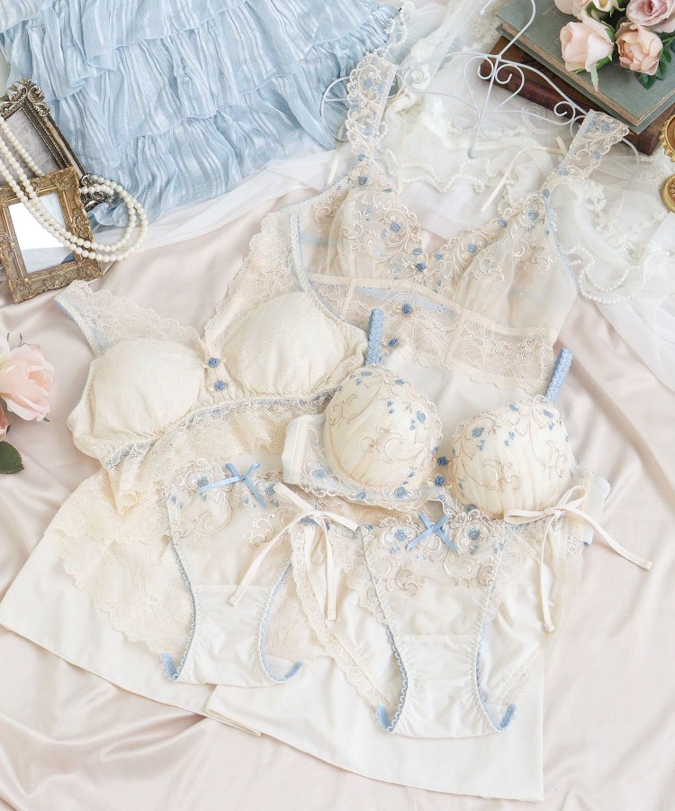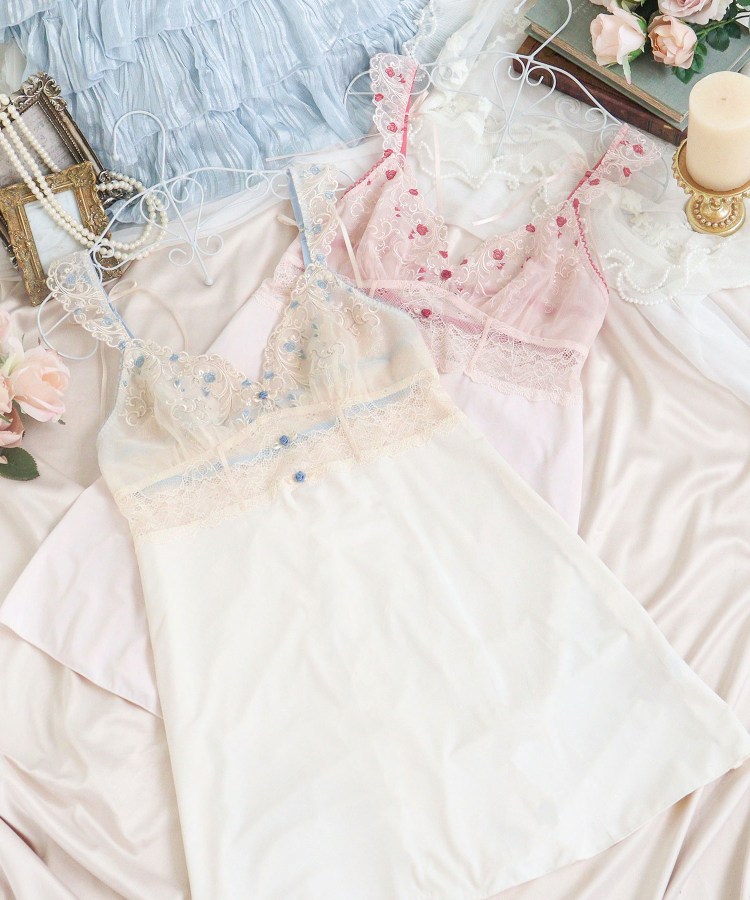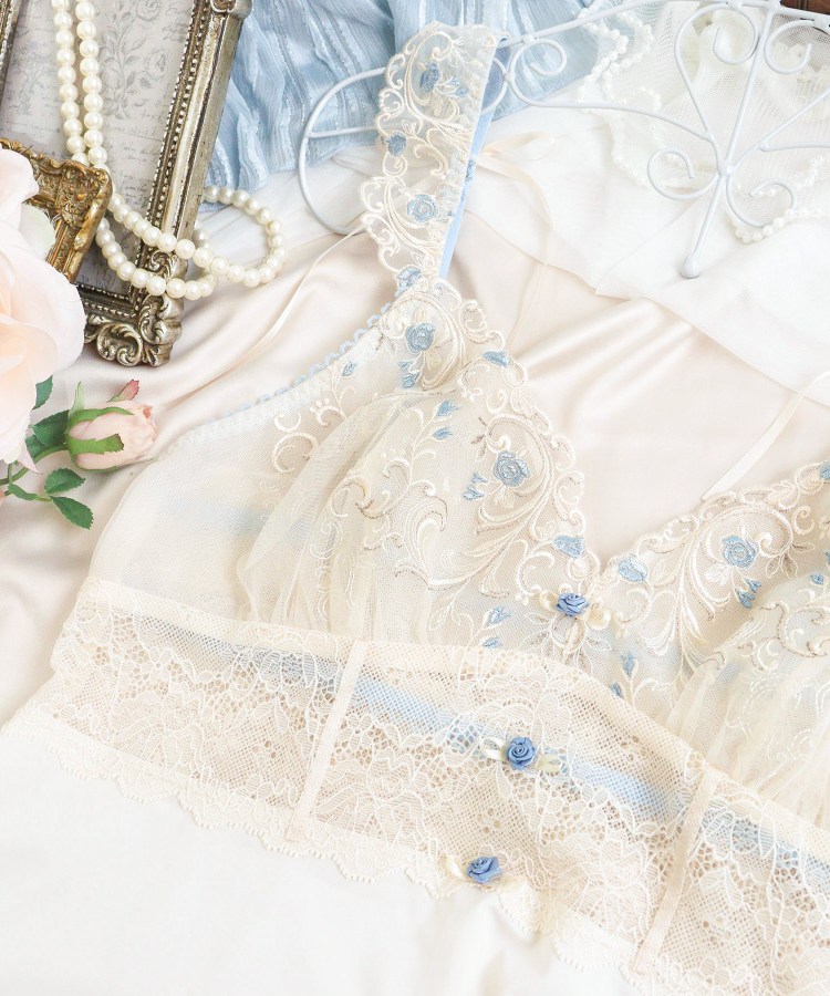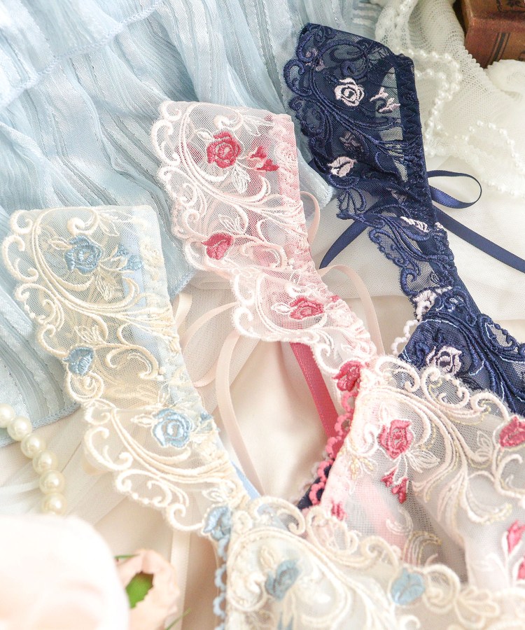ヨーロッパの宮殿の壁画をイメージしたシリーズです。小さなバラと優雅なツタが織りなす幾何学模様が、可愛らしくもクラシカルな印象に。全体的にやわらかなカラーリングでまとめることで、ロマンティックさを感じさせるバラのモチーフが、より印象的に仕上がりました。影を描くように刺繍されたラメ糸は、ほのかにきらめいて上品な可愛らしさを後押しします。フロントには立体的なバラのモチーフとテープを添えて、まるでコルセットドレスのような特別感あふれるアイテムに。ストラップには刺繍レースをほどこして、バックスタイルには結べるタイプのリボンをあしらいました。まるで夢見る少女のような、甘く優雅な世界観を演出するコレクションです。
