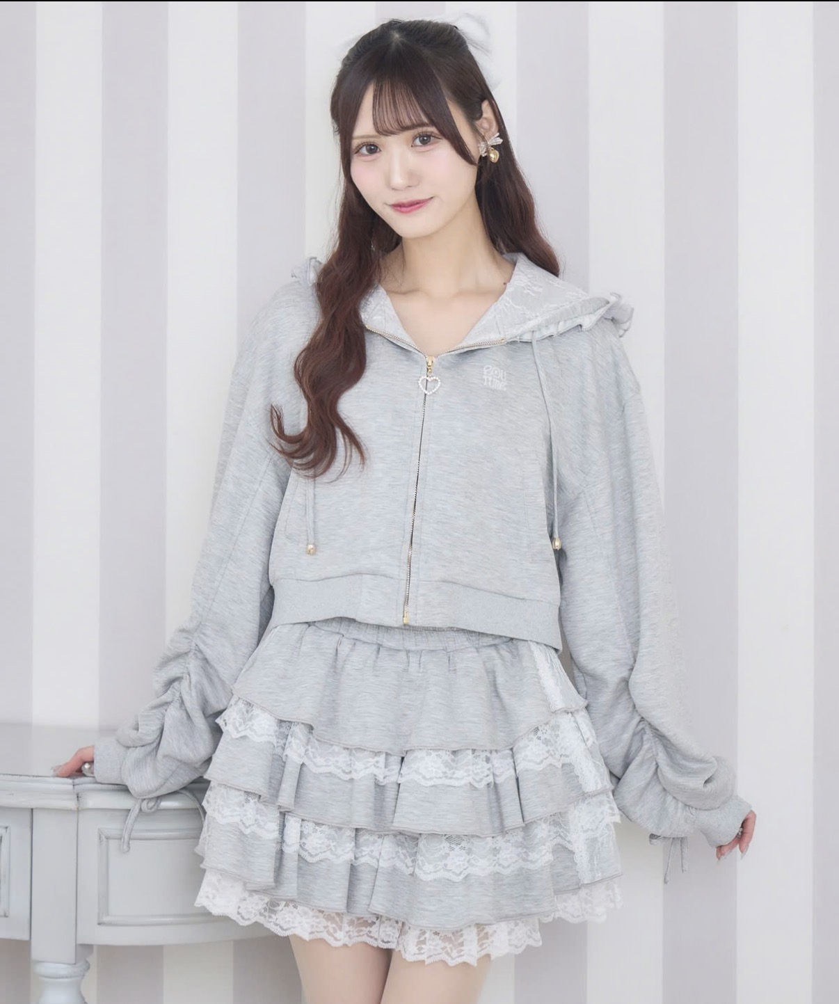 フードにあしらったフリルが印象的な、フェミニンムード漂うスウエットパーカー。袖のドロストデザインがさりげないアクセントとなり、シルエットのアレンジも楽しめます。程よく短めの丈感で、スタイルアップ効果も◎ハイソックスやミニボトムと合わせたトレンド感のあるスタイリングがおすすめです♪