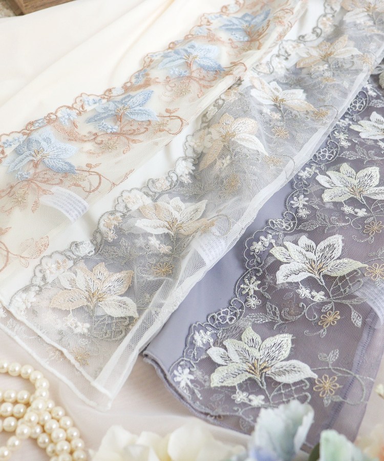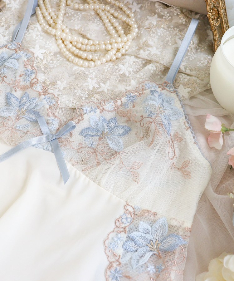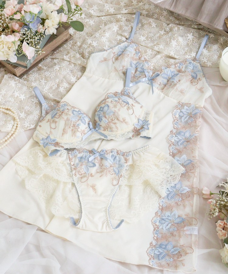 「幸せを運ぶ」ユリの花、カサブランカをイメージした「フルーリ」が、新機能のノンワイヤーシリーズになって登場。花びらをあたたかみのあるウーリー糸と普通糸、ラメ糸をミックスして刺繍することで、柄行の変化や奥行きを表現。レース全体に小花を散りばめ、ツルの中にはさりげなく格子柄をあしらうなど、心ときめくディテールをプラスしました。スカラップは丸みのあるデザインにすることでやわらかい印象をもたせ、カサブランカの大人っぽくシャープなイメージを、リサマリらしいフェミニンな印象へと仕上げました。サイドには幅広の刺繍レースを前後に縫製して、ボディラインを美しく演出。バックスタイルには花柄のストレッチレースをあしらいました。たくさんのブーケに包まれて、まるでお花の香りがふんわりと漂ってくるような、特別感のあるランジェリーアイテムです。カラーはカサブランカの花言葉「純粋」「祝福」を連想させるような、スモーキーな優しいトーンで展開しています。