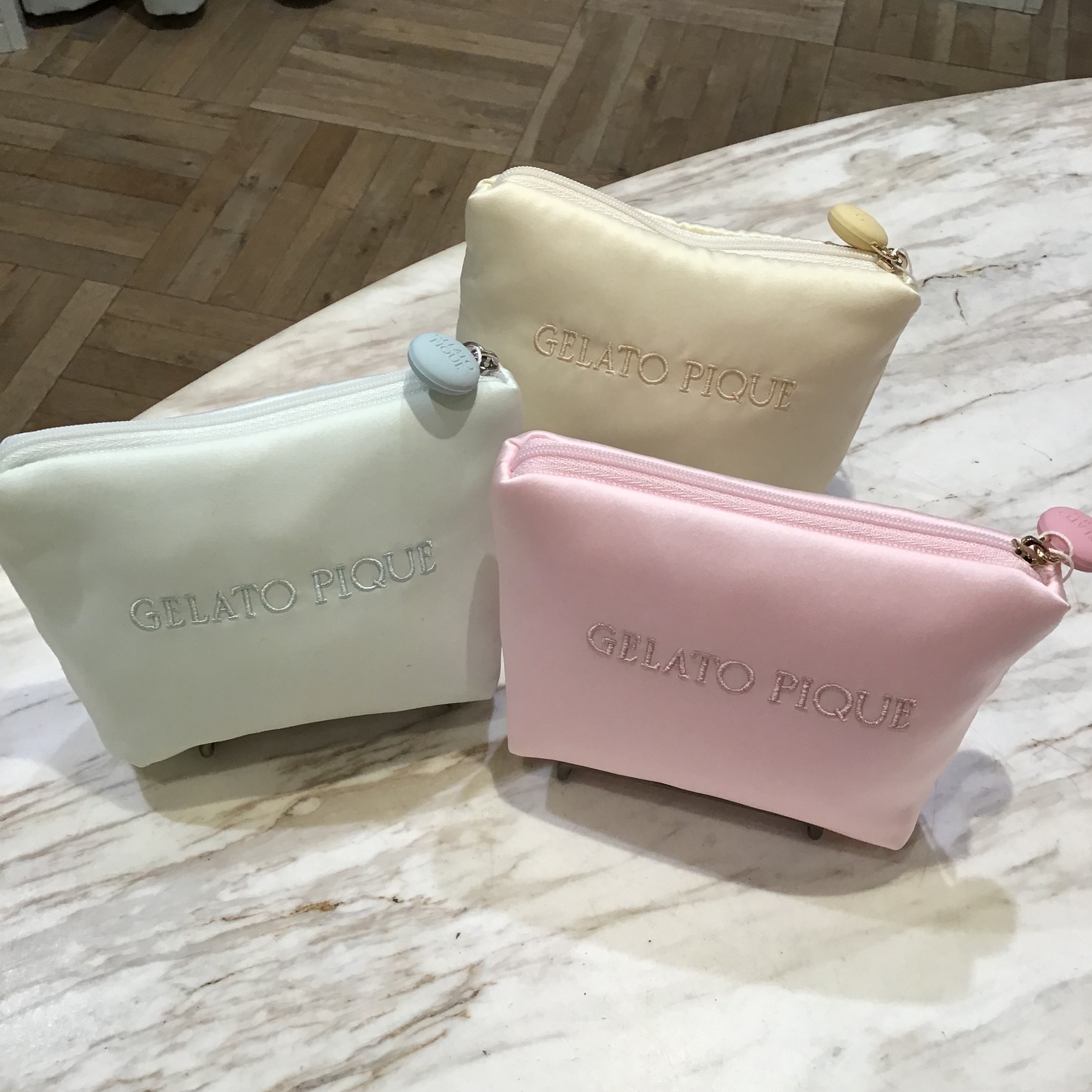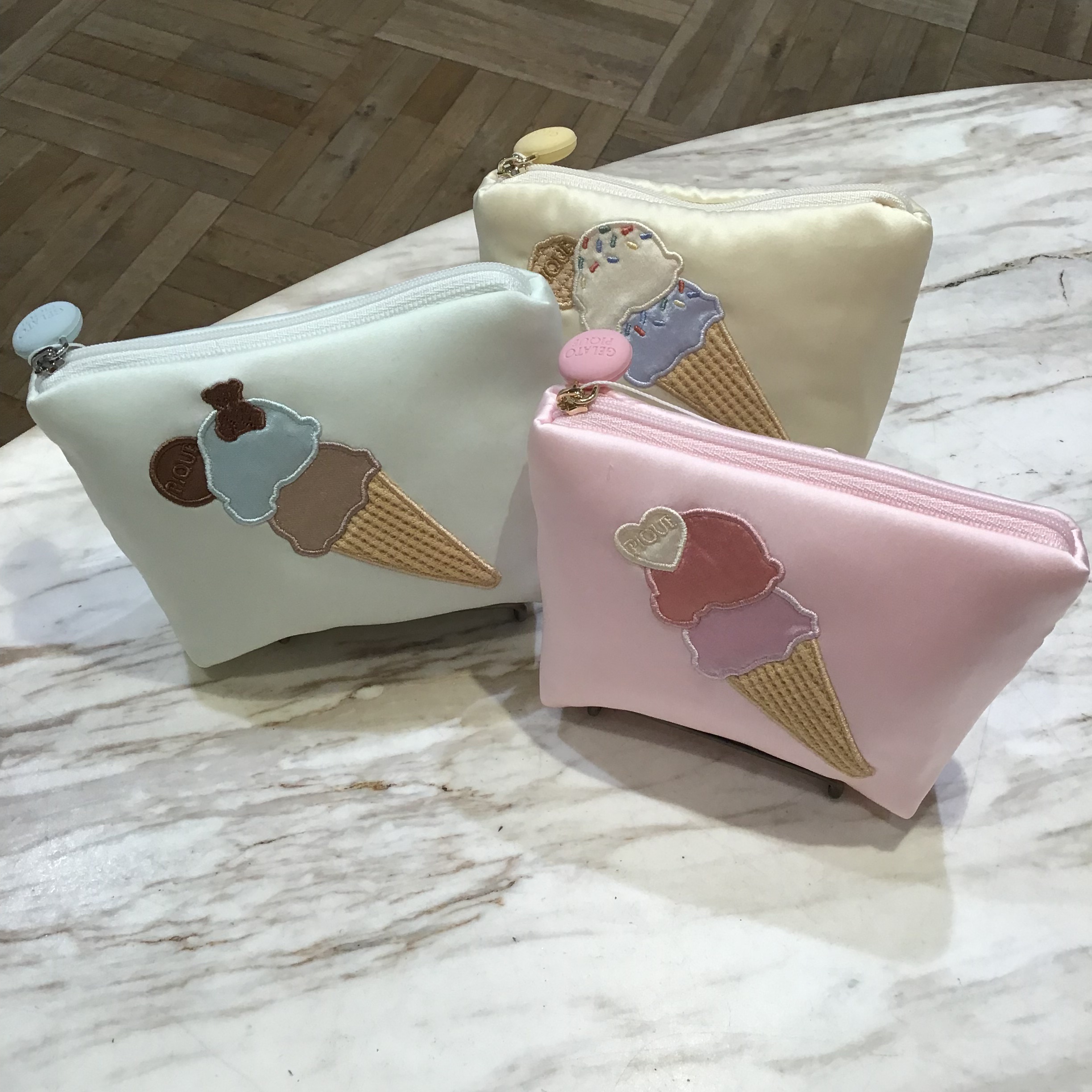 ベアやハート、カラースプレーなどをデコレートしたアイスクリームをアップリケで表現した、台形のミニポーチ。小さめでもマチありで内ポケットも付いているので、お化粧直しのアイテムもコンパクトに収納していただけます。カラフルなファスナーの引き手と、コーン部分にワッフルの生地を使用しているのがこだわりポイント。色はクリームとピンク、ミントの3色を揃えました。同シリーズの雑貨を組み合わせてギフトにもおすすめです。