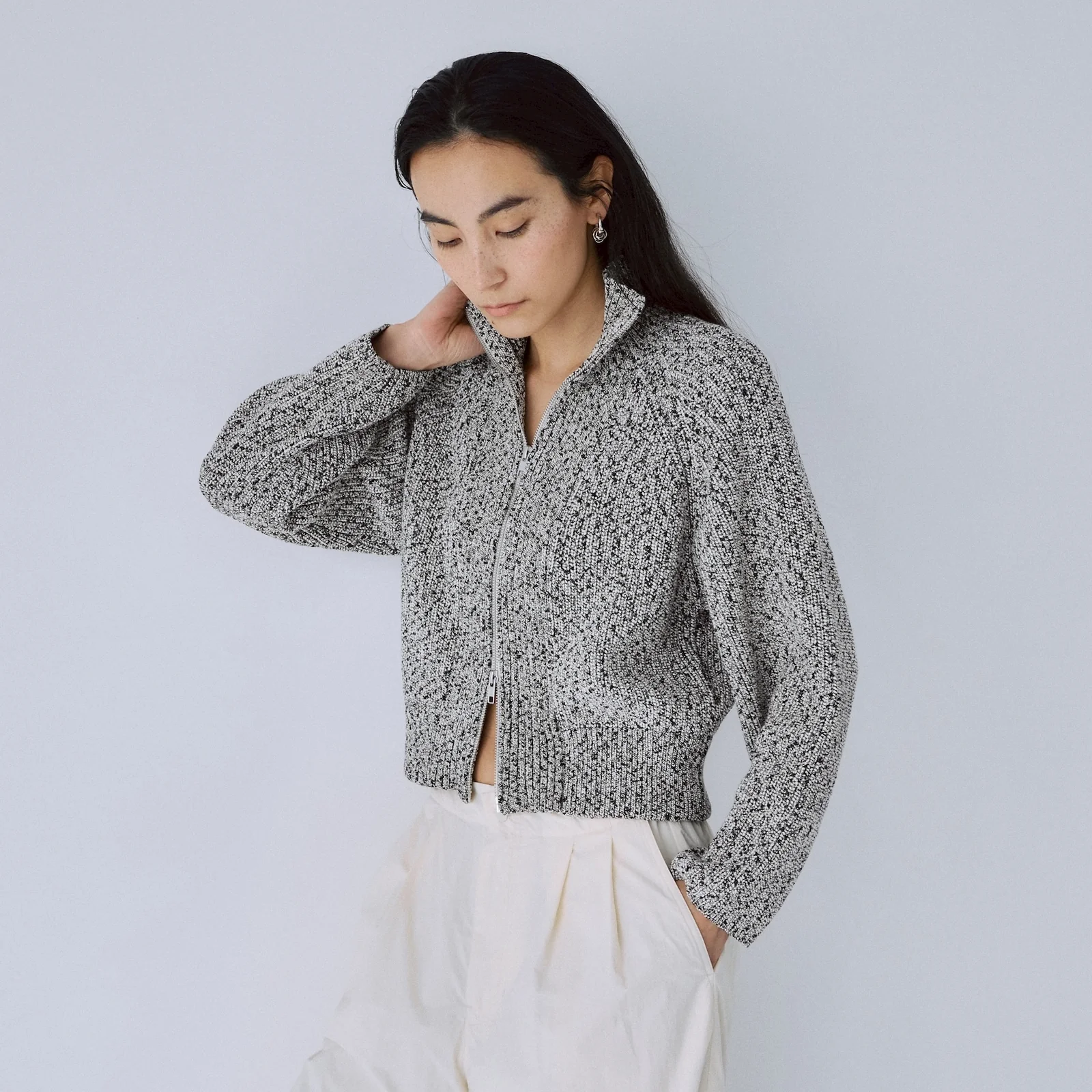 ホワイトベースの糸にネップ糸を撚り合わせた、表情豊かなメランジ(2色以上の色が混ざった)素材を使用。
