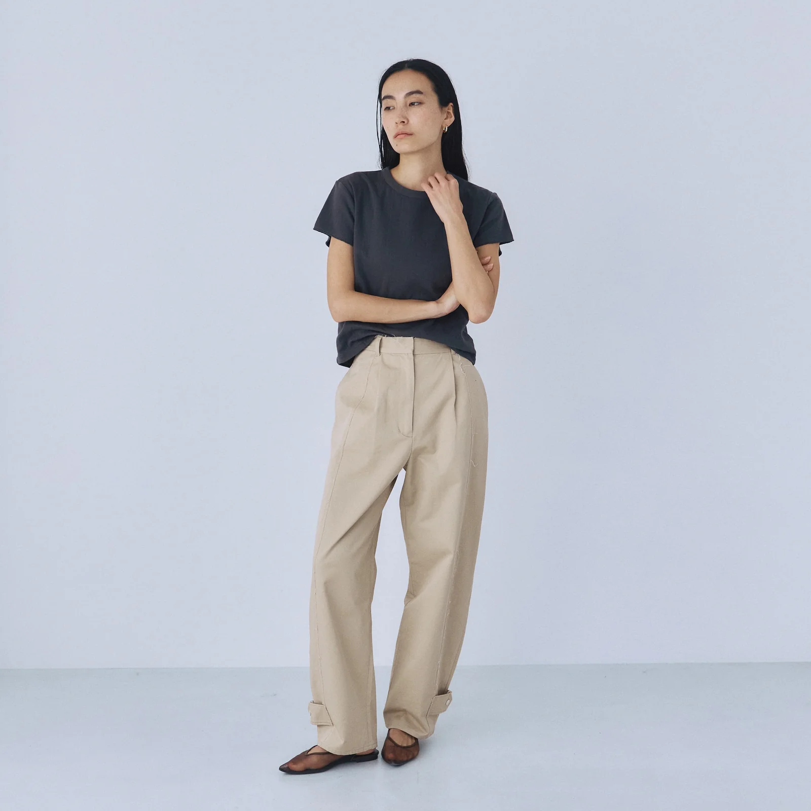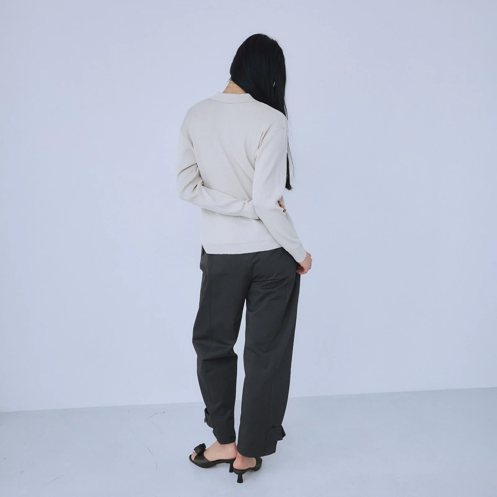 コンパクトなリブニットやタイトなTシャツを合わせて、パンツのボリューム感を引き立てるスタイリングがおすすめ。