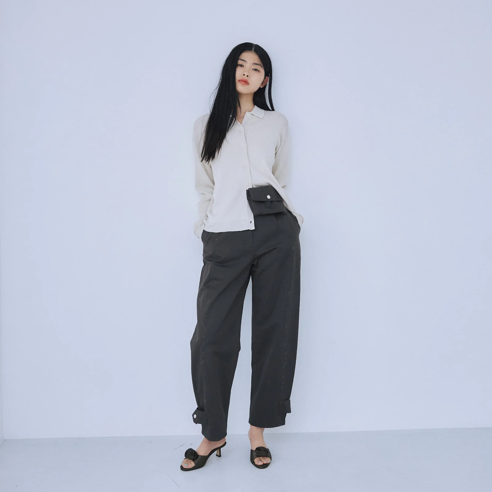 ポーチをウエストマークとして取り入れることで視線が上がり、フラットシューズやローファー合わせでもバランス良く決まります。