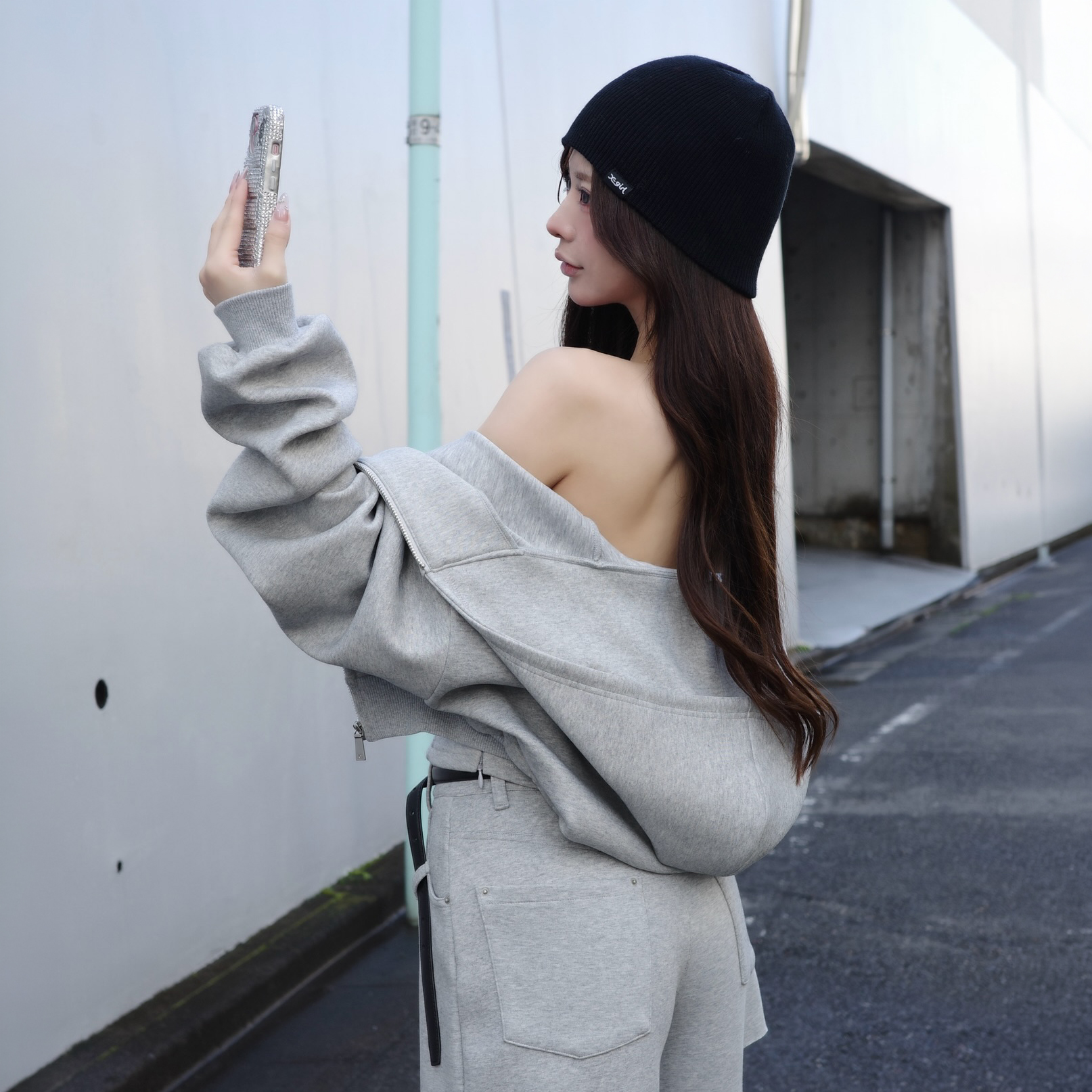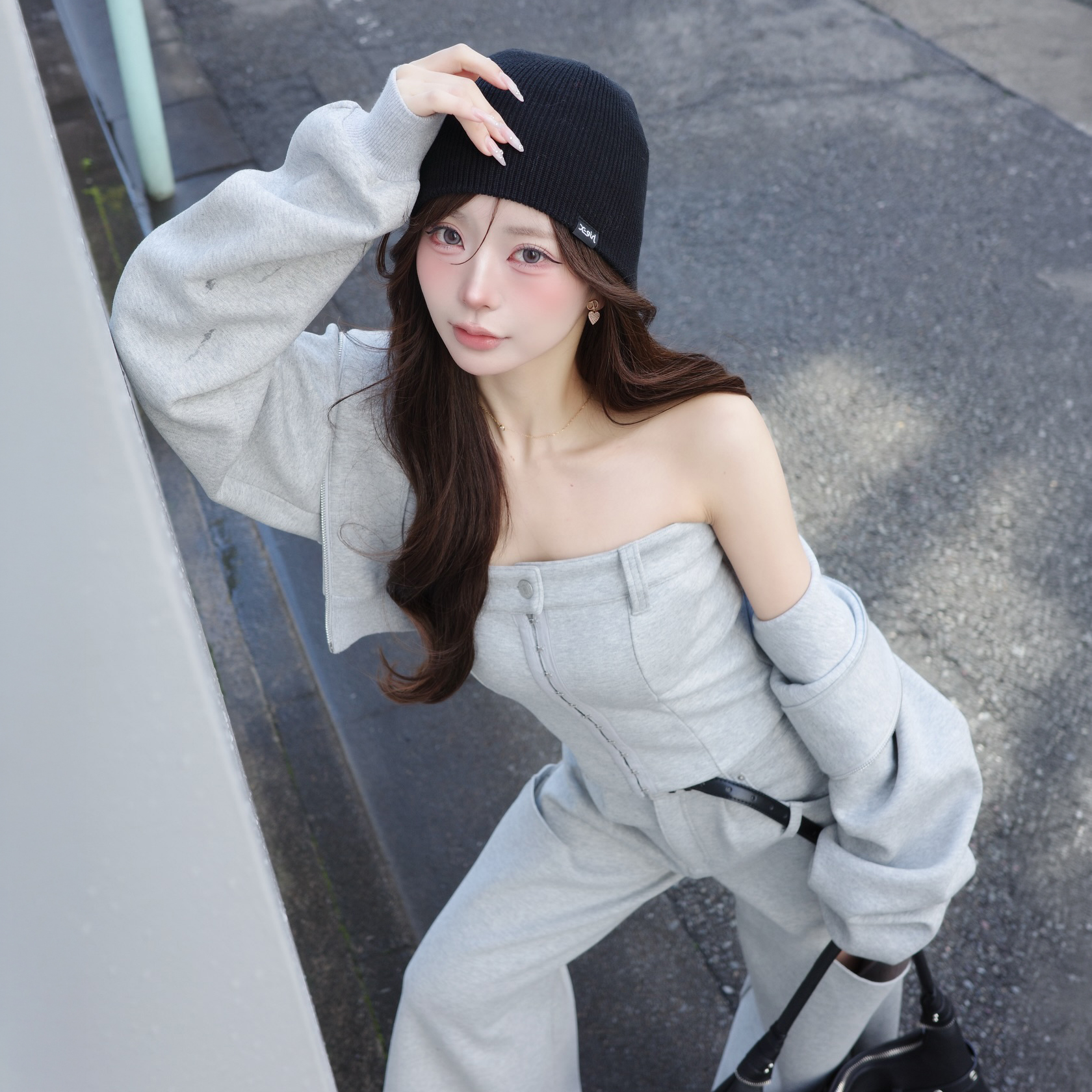 立体感のあるスウェット素材で仕立てた、ショートフーディー×ベアトップのアンサンブル。