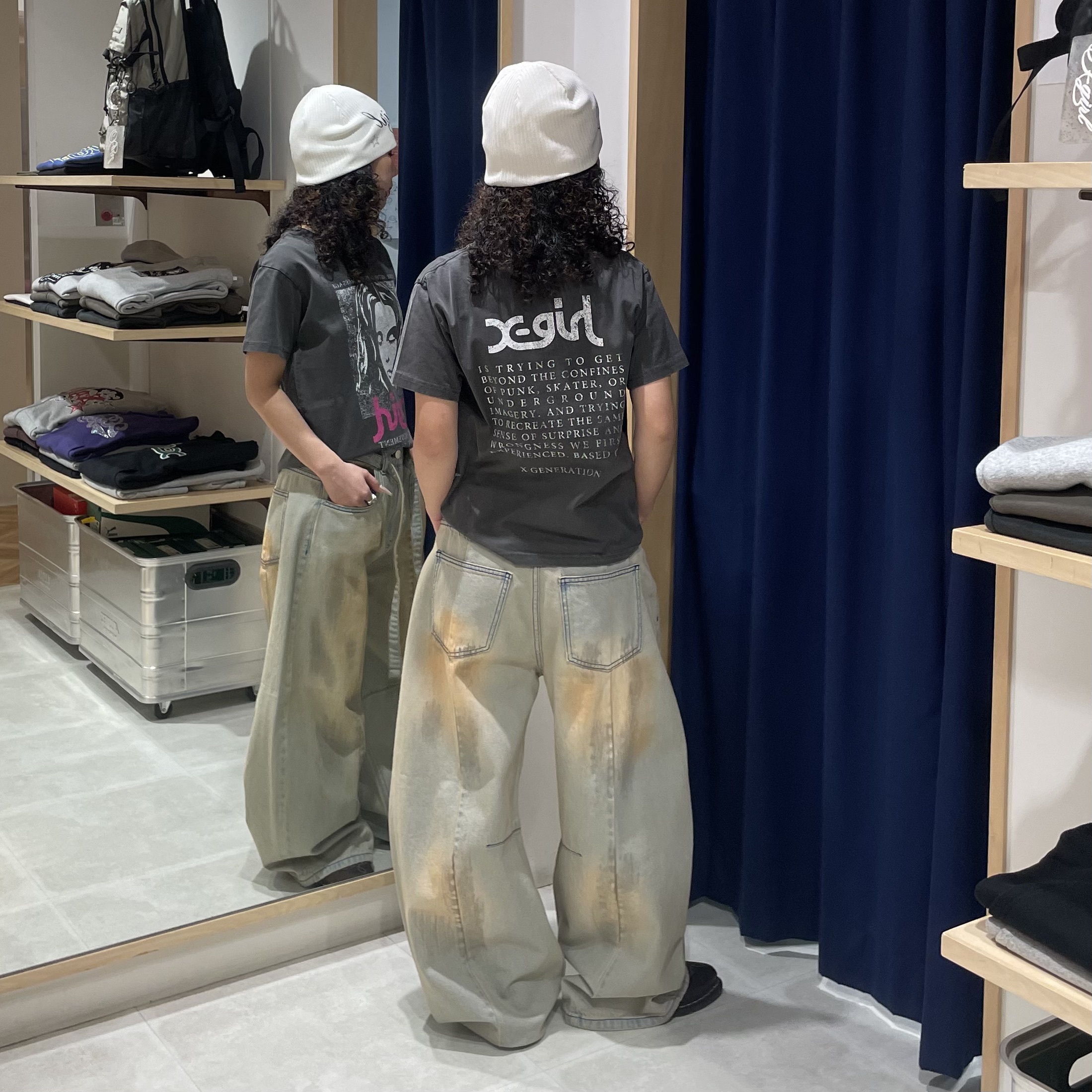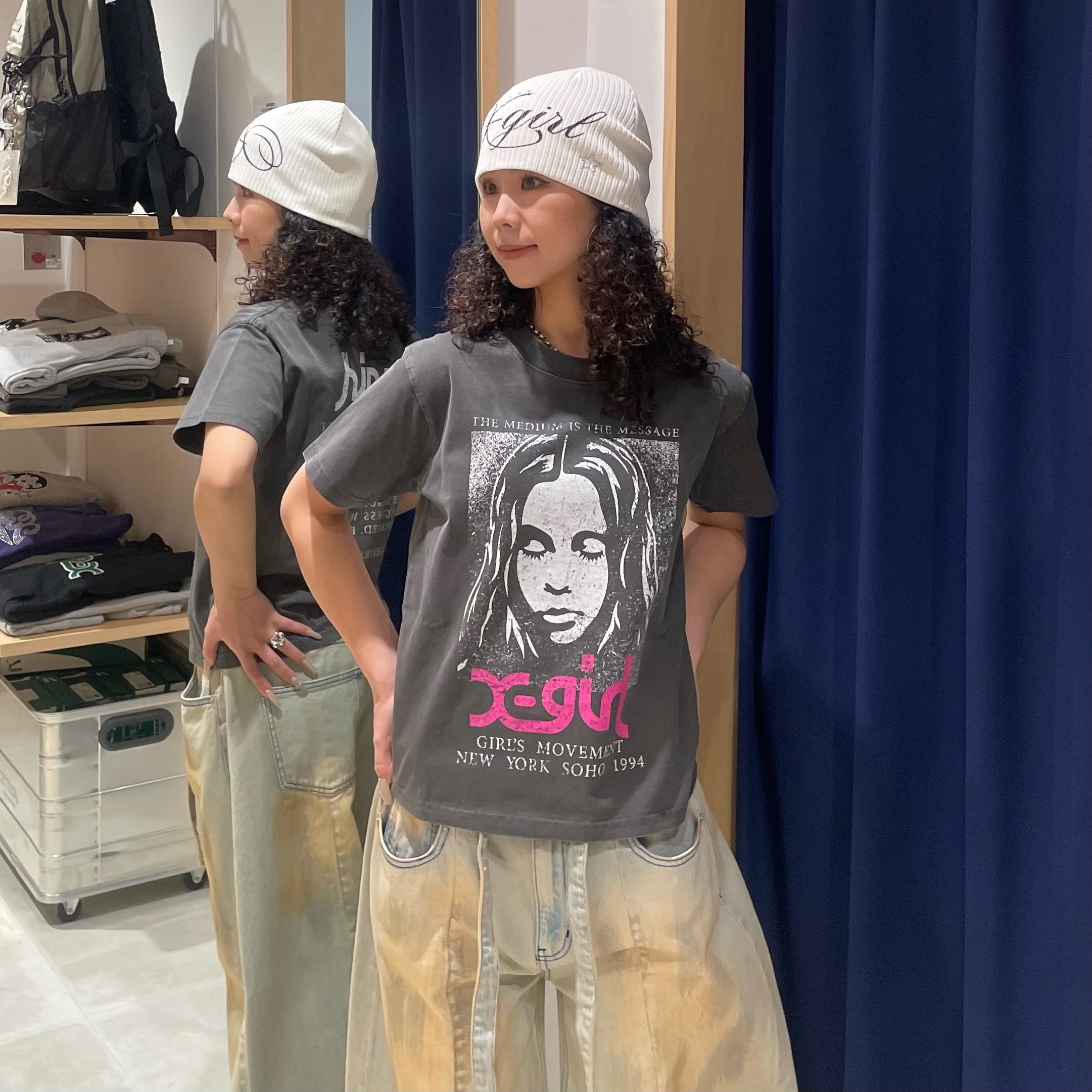 バックスタイルは、X-girlロゴとメッセージをプリントした目を惹くデザイン。