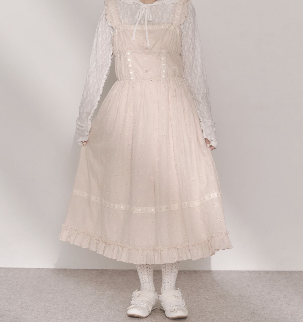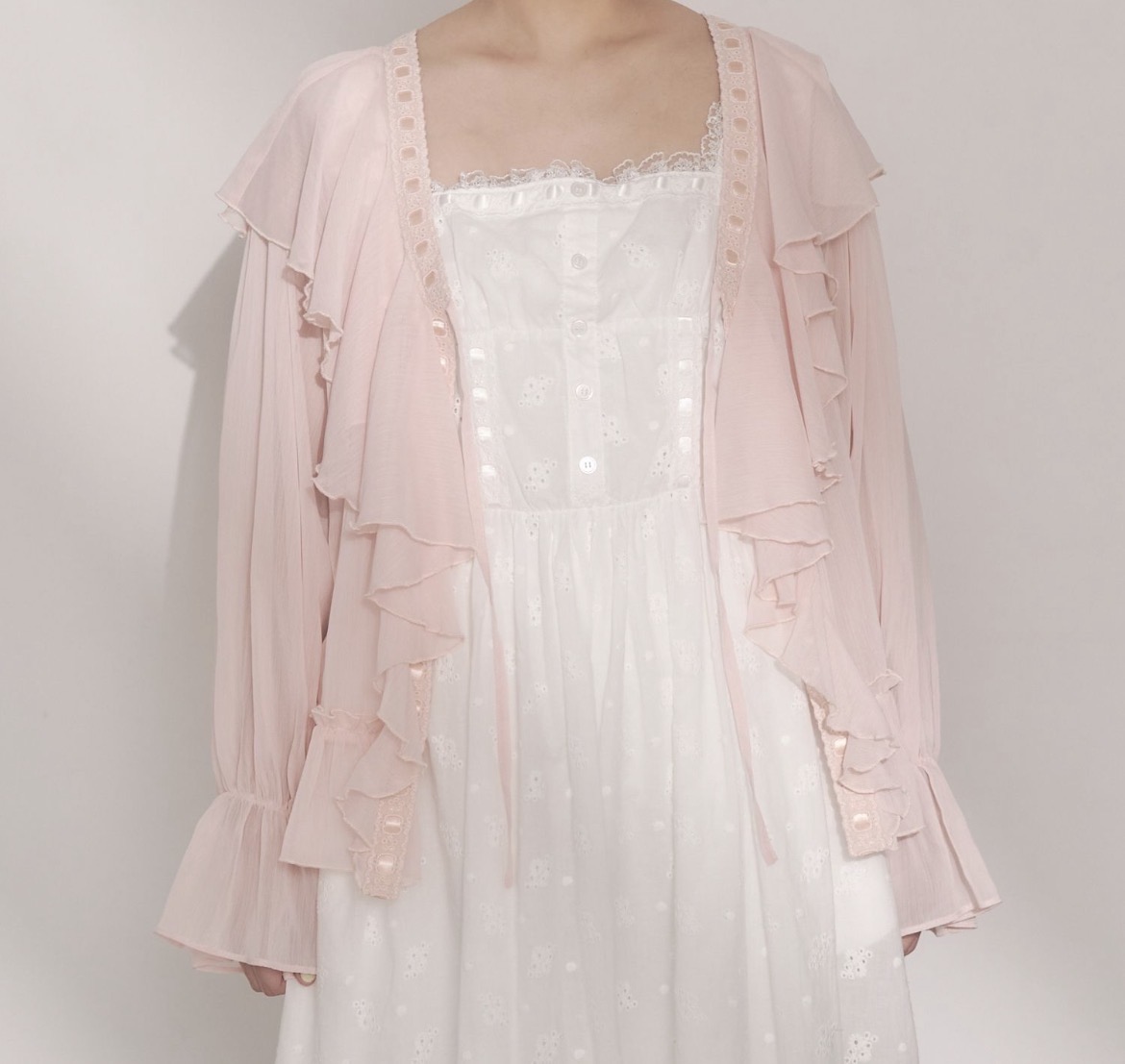 はしごレースやサテンリボンを通したディテールが、リメイクのようなやさしい表情を添えています。