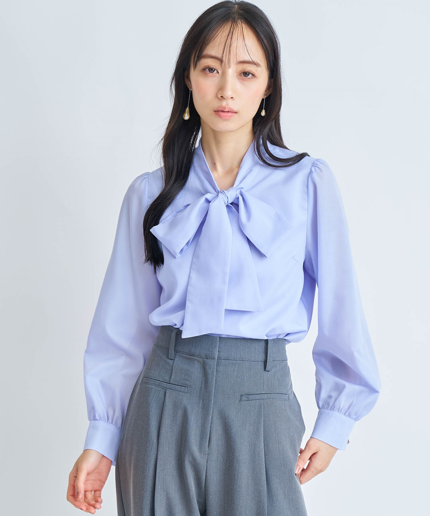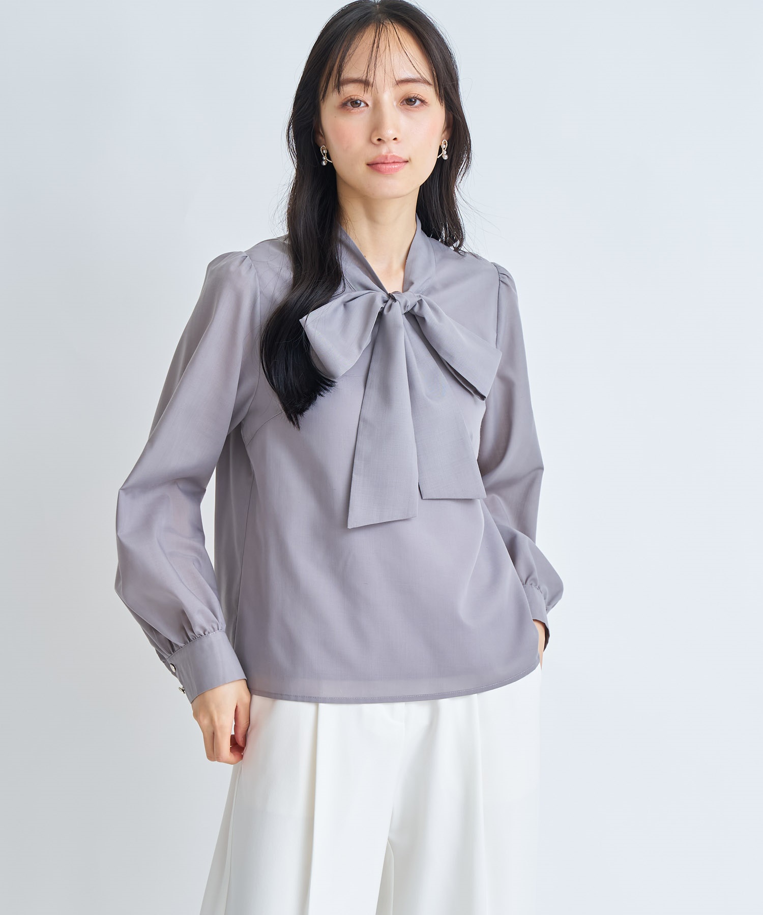 大きめのボウタイリボンが視線を惹く、華やかなデザインブラウス。