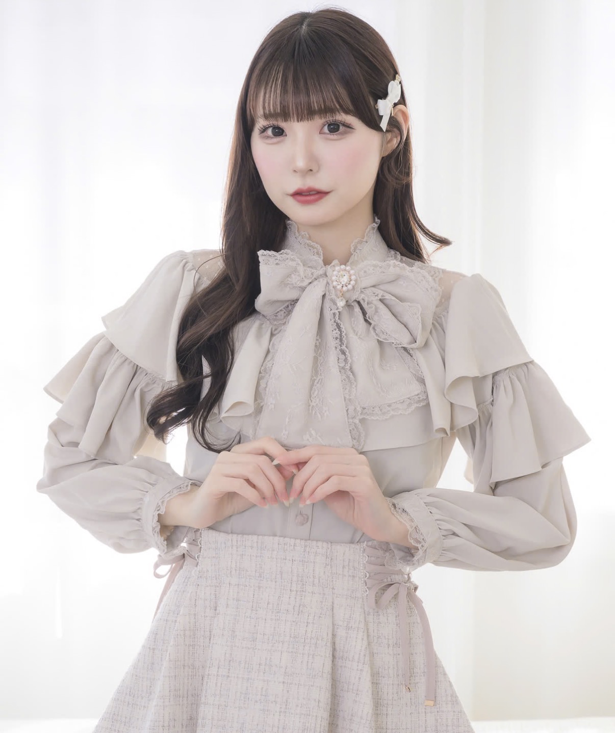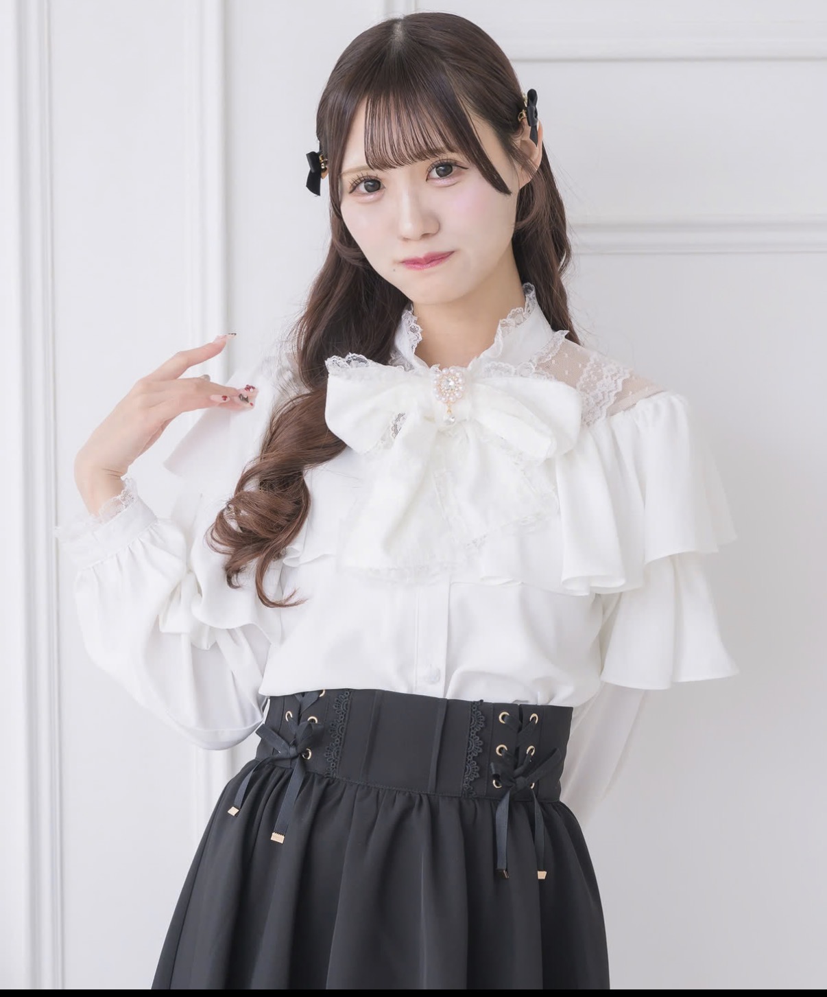 袖コンシャスなデザインブラウス♡デコルテ部分には透け感を取り入れ、ちょうどストラップ部分にレースラインが入っているのもポイント。テロンとした柔らかい生地感が、女性らしい落ち感を演出します。ボウタイリボンが上品さを添え、知的でお育ち感のある雰囲気に♪
