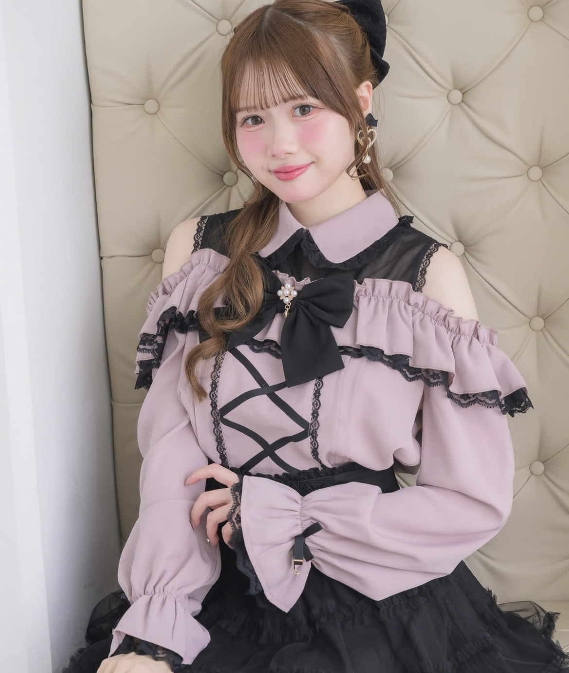 大胆なフロントレースアップが、コーディネートのアクセント役に♪オフショルフリルが華奢なショルダーラインを美しく演出し、デコルテ部分にはドットチュールを重ねて周りと差をつけます。地雷系の甘さを取り入れつつ、印象的なスタイルを叶えるブラウスです。