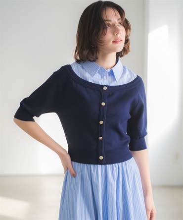 ネイビーは襟元にトレンドのストライプを取り入れ、「ストライプフレアスカート(品番:5622036)」と合わせてワンピースライクにも。