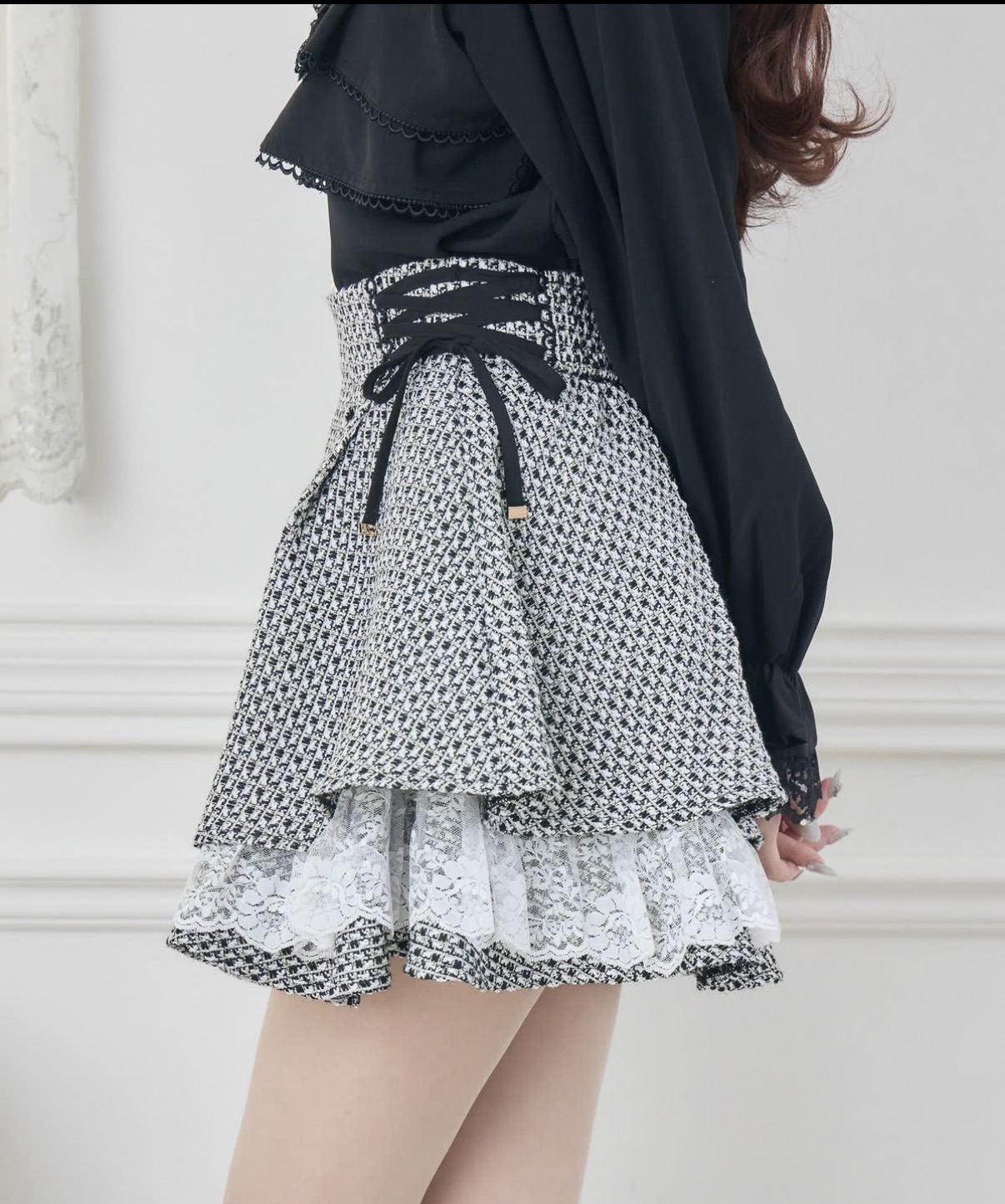 ふんわり広がるAラインシルエットが魅力のツイードスカパン♡サイドのレースアップリボンでウエストをマークでき、メリハリのあるラインを演出します。定番デザインをアップデートし、セットアップ対応のジャケットと合わせれば、よりきちんと感のある着こなしに◎