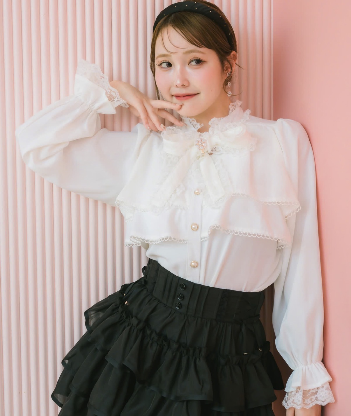 ふんわりとした2段ティアードが可愛らしいブラウス♡ヘムラインにはピコレースをあしらい、繊細で上品な印象に。細身でスッキリとしたボウタイリボンにはレースを重ね、華やかさをプラス。鎖骨の中心は控えめなVカットで、抜け感のある女性らしい雰囲気を演出します。