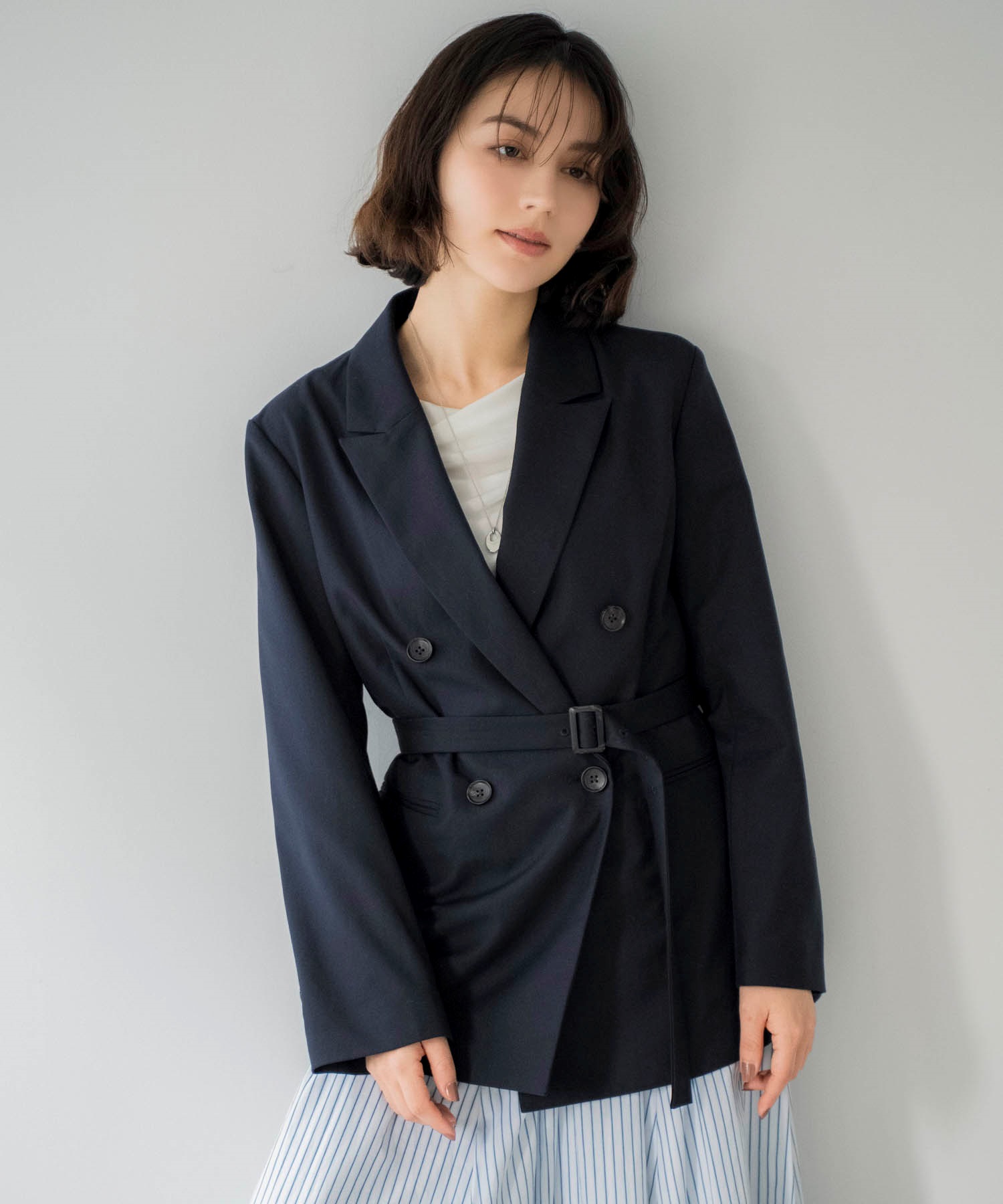 共地のベルト付きで、ウエストにメリハリをつけた女性らしい着こなしが楽しめます。