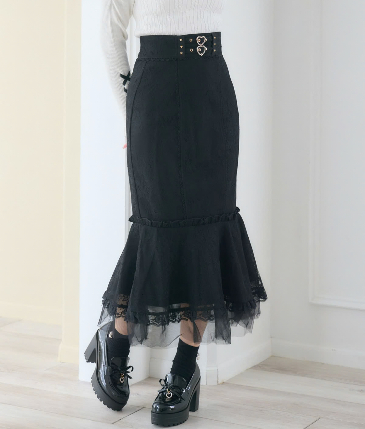 レースの上品さとハートバックル付きのウエストベルトの可愛さが好バランスなロングスカート♡繊細なレース素材が全体を引き締め、ヒップラインを美しく見せる切り替えラインで自然なシルエットを演出します。裾にはチュールを重ね、足元に軽やかな抜け感をプラス。