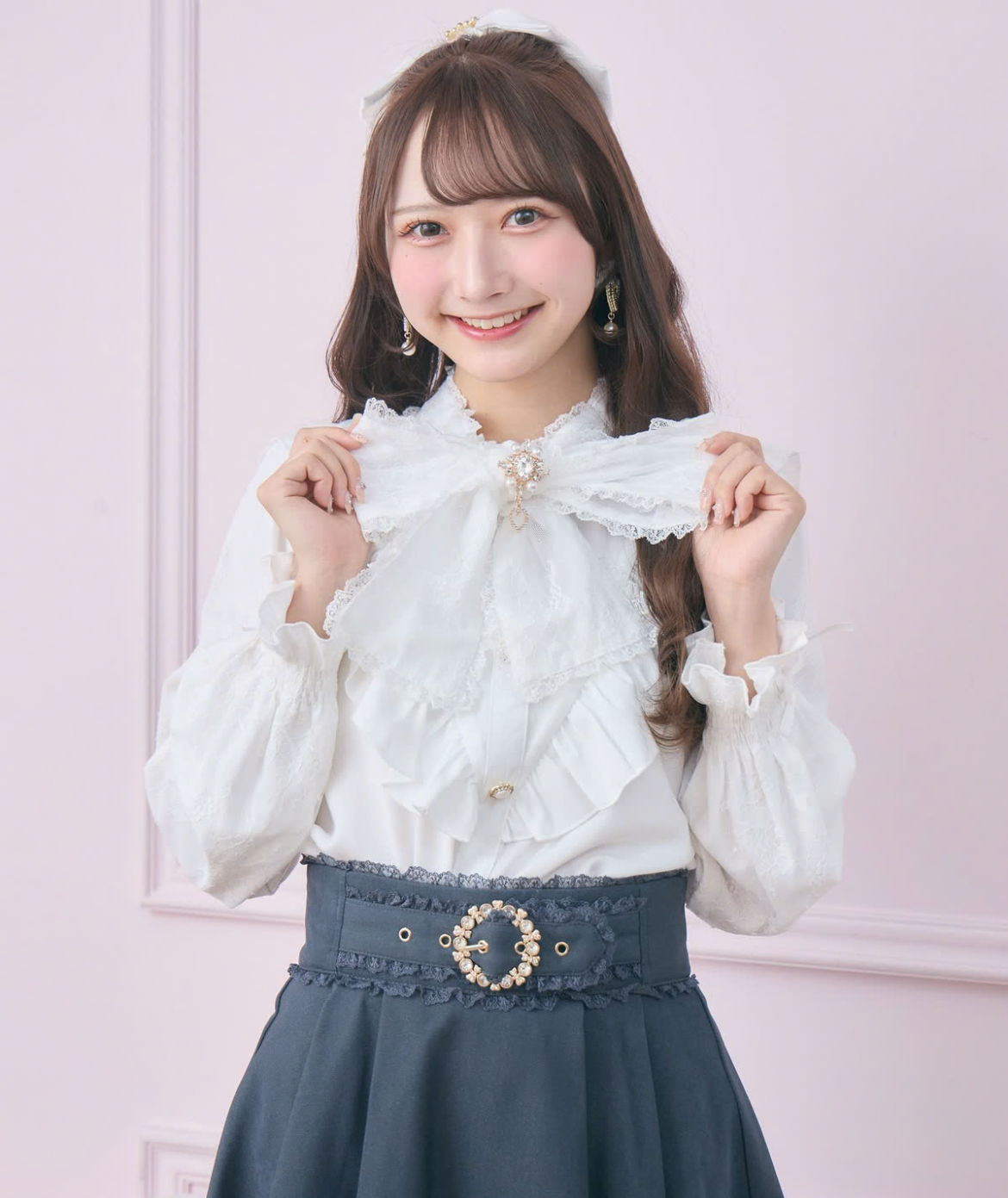 ヨーク部分にVフリルをあしらった、ムードたっぷりの長袖ブラウス♡レースのボウタイがアクセントになり、上品さをプラスします。前から見るとボタンデザインですが、実際は後ろスナップでかぶって着るタイプ♡着脱も簡単で、見た目も可愛い一枚です。