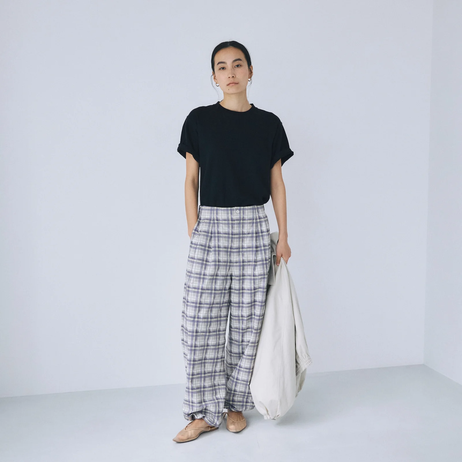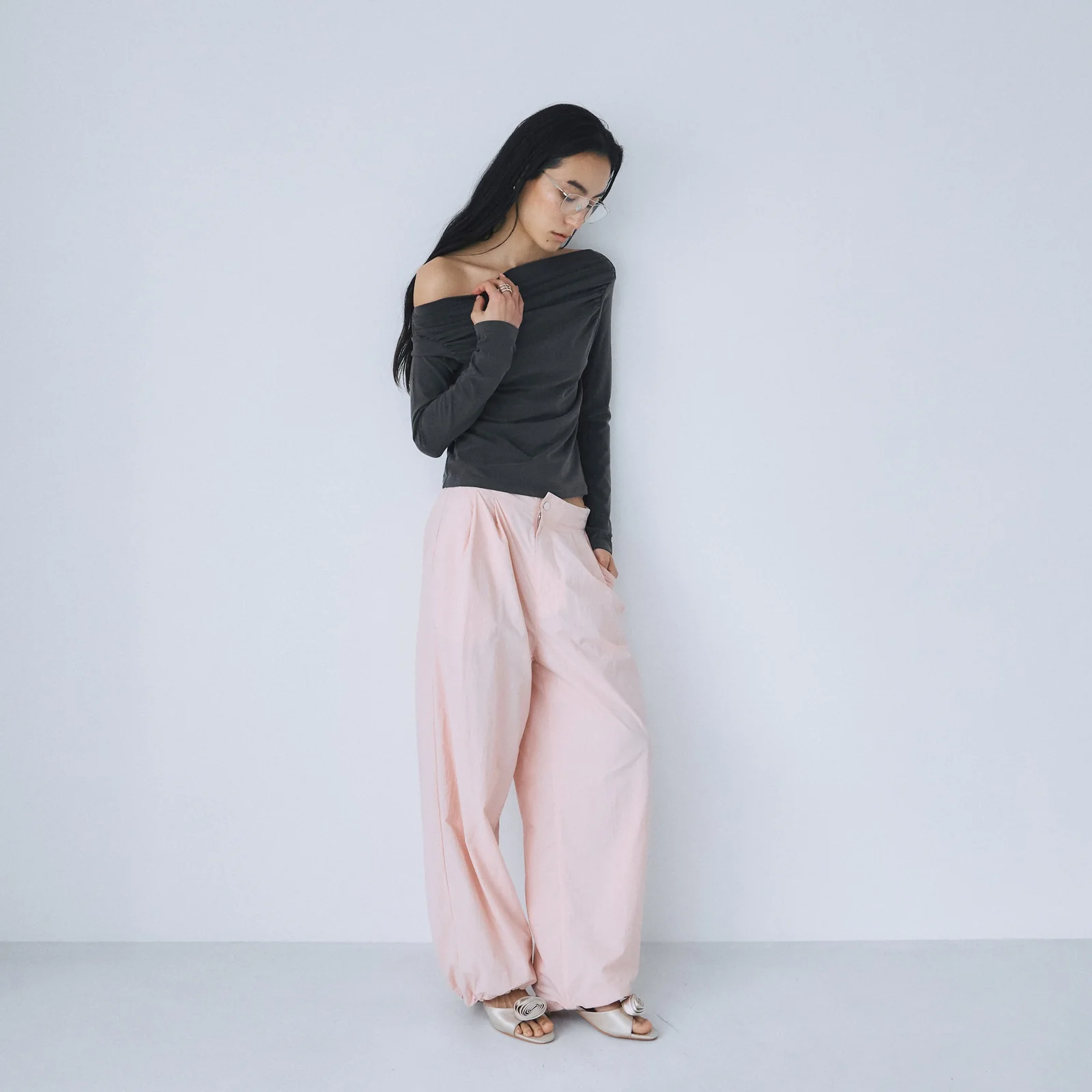 コードを絞ればアクティブなジョガーシルエットへと変化し、足元や気分に合わせた2WAYでバランスを楽しめます。