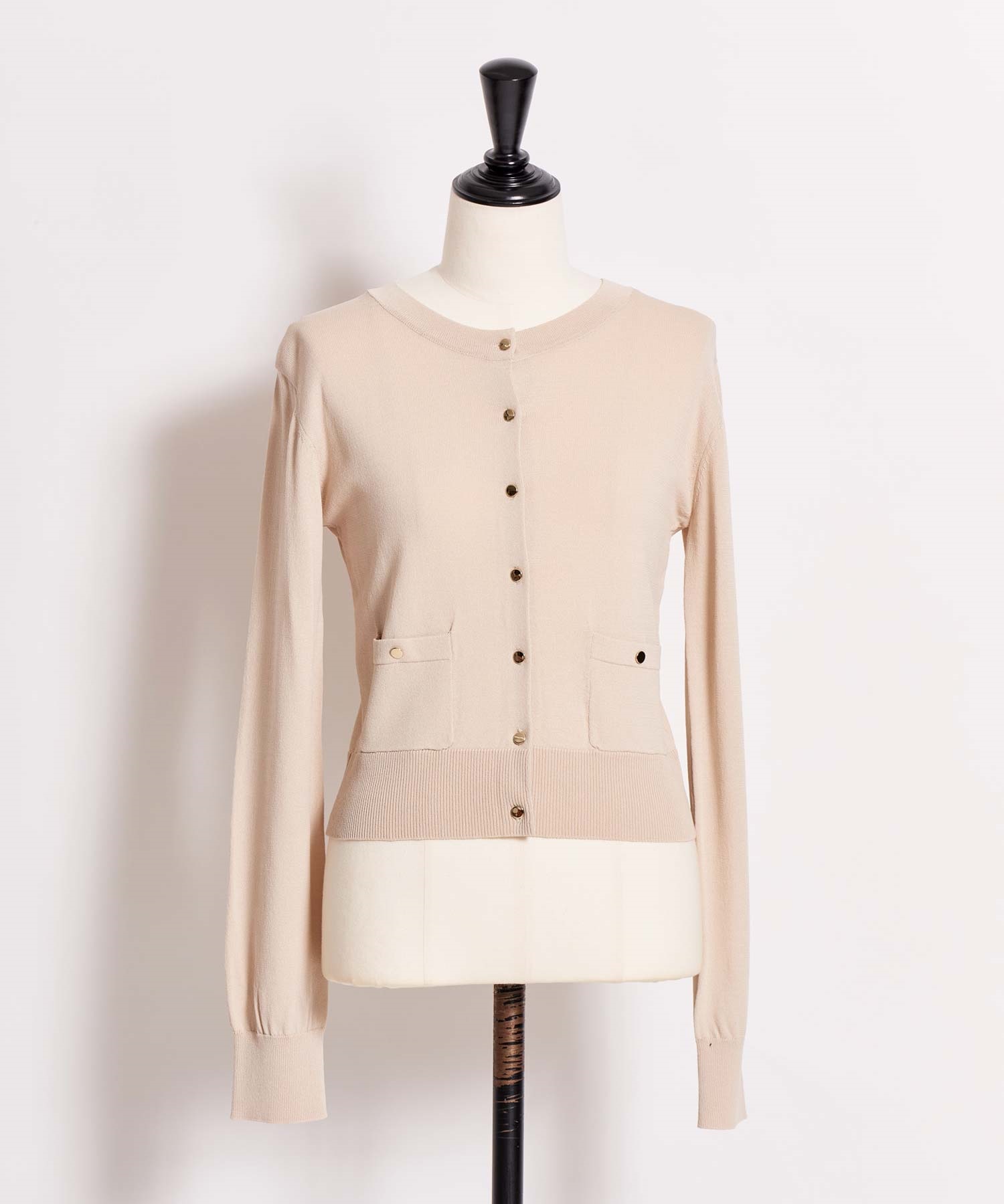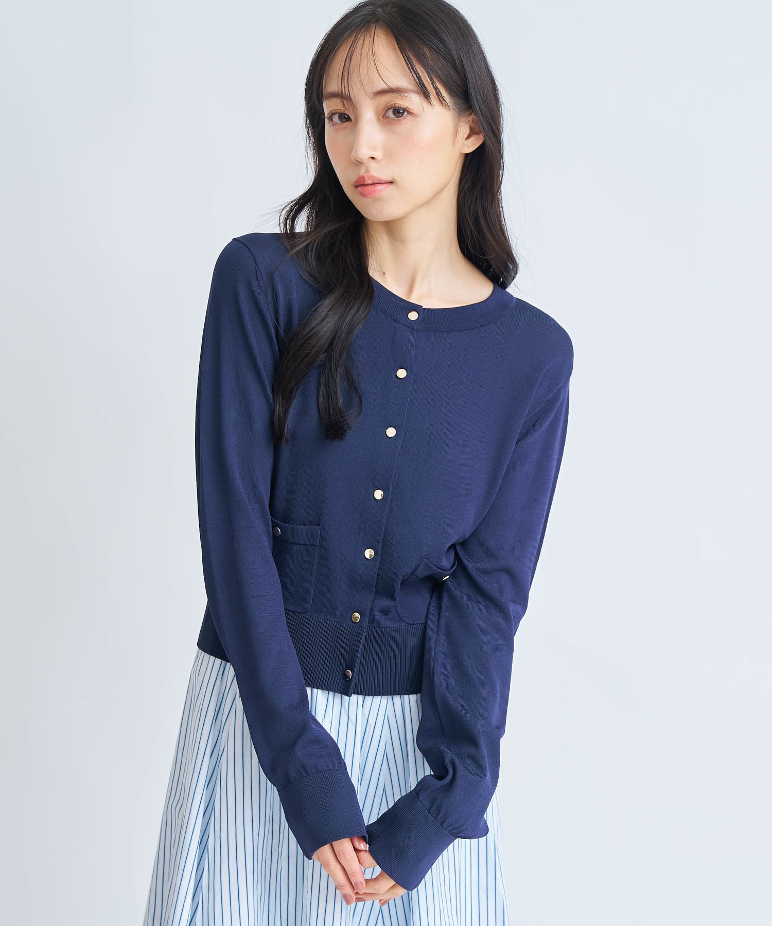 コンパクトな丈感とフロントのゴールドボタンが、スタイルをすっきり見せるポイント。