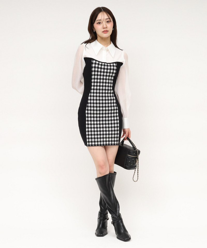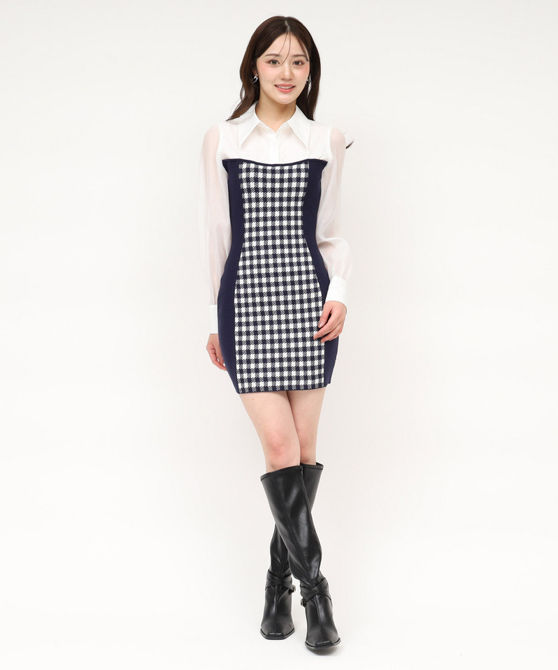 シャツとニットをドッキングした、1枚で洗練されたスタイルが完成するミニワンピース。