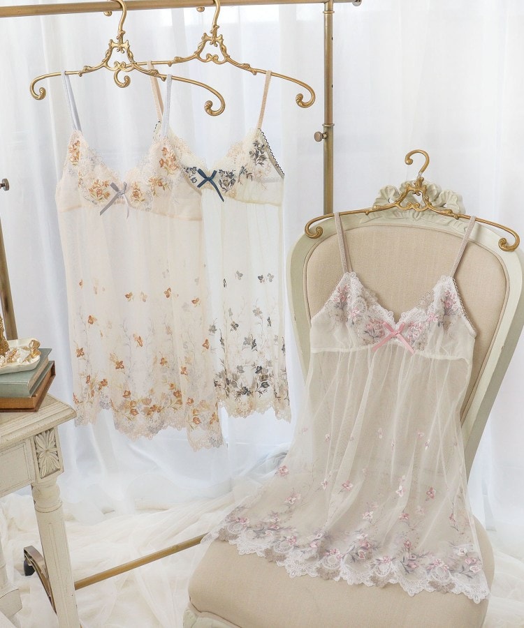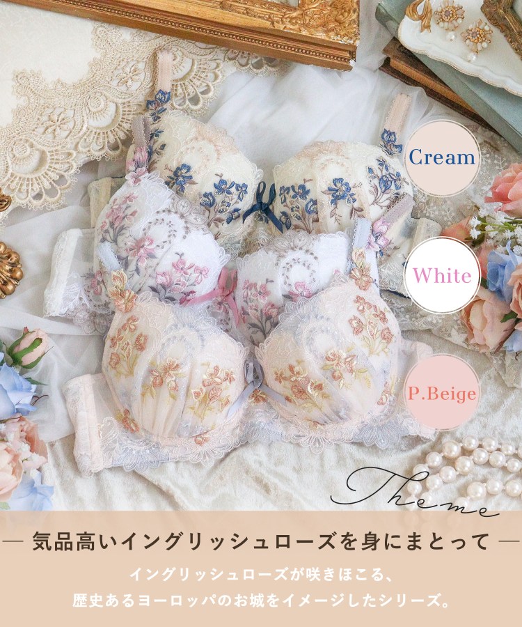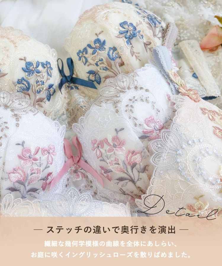 大人気を博した「アリーシャ」が、新しいカラーを加えてリバイバル。イングリッシュローズが咲きほこる、歴史あるヨーロッパのお城をイメージしたシリーズです。建物の優美な装飾を表現したレースは、繊細な幾何学模様の曲線を全体にあしらい、女性らしくも印象的なデザインに。配色は交互にすることで、思わず目をひく華やかさを演出します。カップにはお庭に咲くイングリッシュローズを散りばめ、きらめくラメ糸で豪華に仕上げました。その周りにはメインのお花を引き立てる手描き風のラフなステッチで、お花や曲線のモチーフをほどこして奥行き感をプラス。ストラップにはお揃いのアップリケをあしらいました。気品高いエレガントなイメージを身にまとうような、特別感あふれるコレクションです。