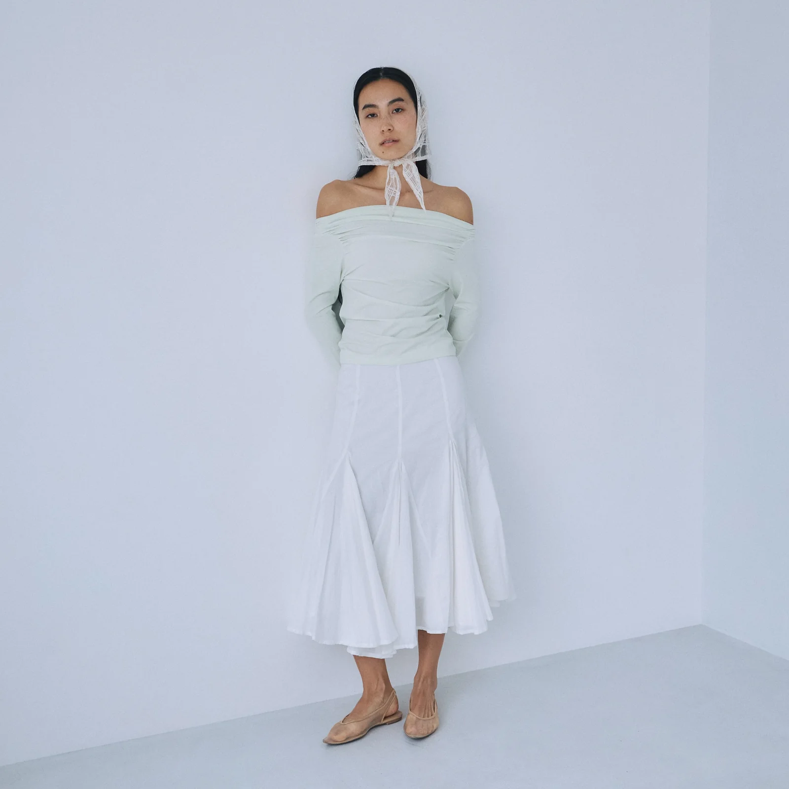 フェミニンな印象が強いコットンスカートを、あえて腰位置で落として穿く設定にすることで、都会的なカジュアルさやモード感をプラス。