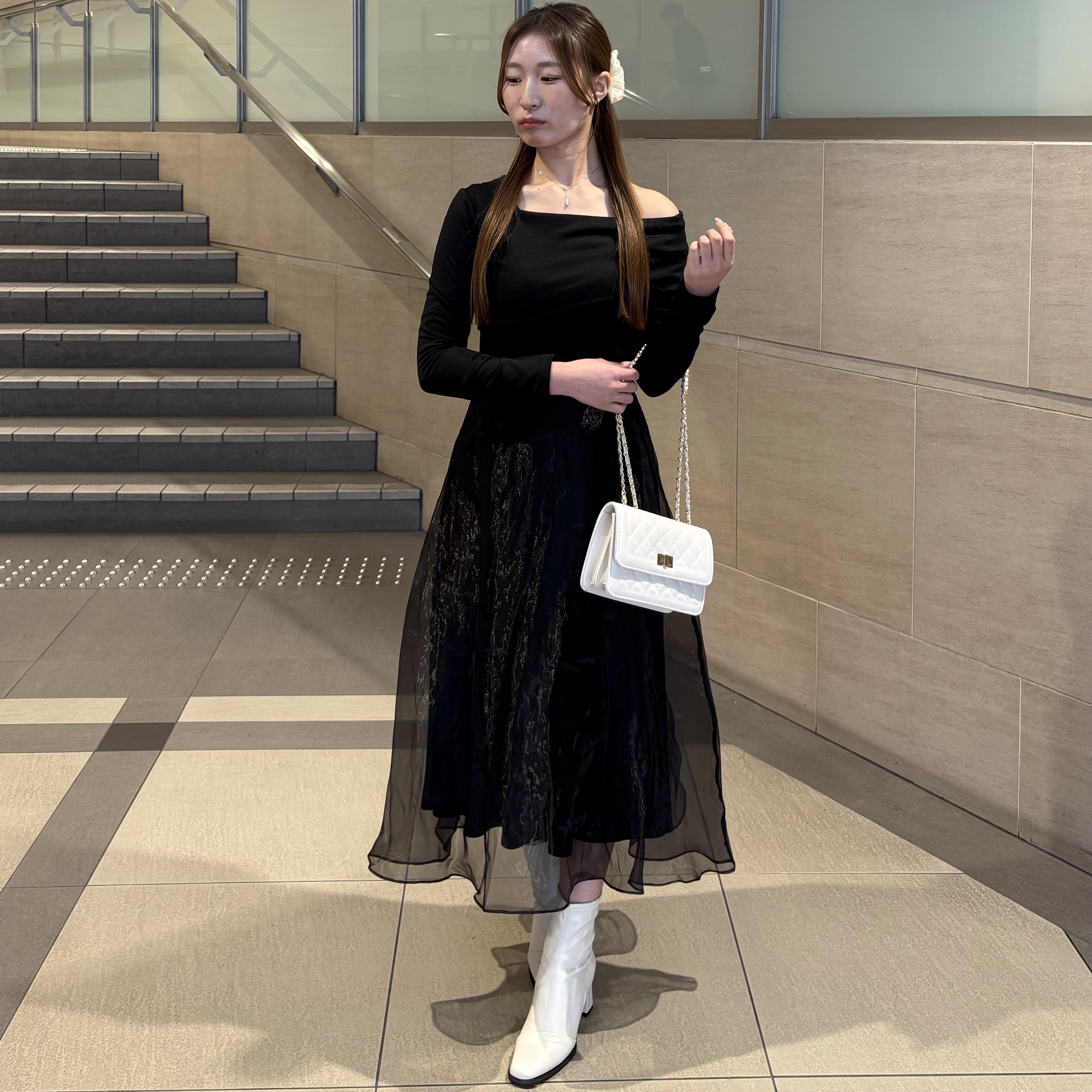 ウエストからシフォンフレアの切り返しになっているので気になるお尻周りをカバーし、メリハリ綺麗に着ていただけます♪