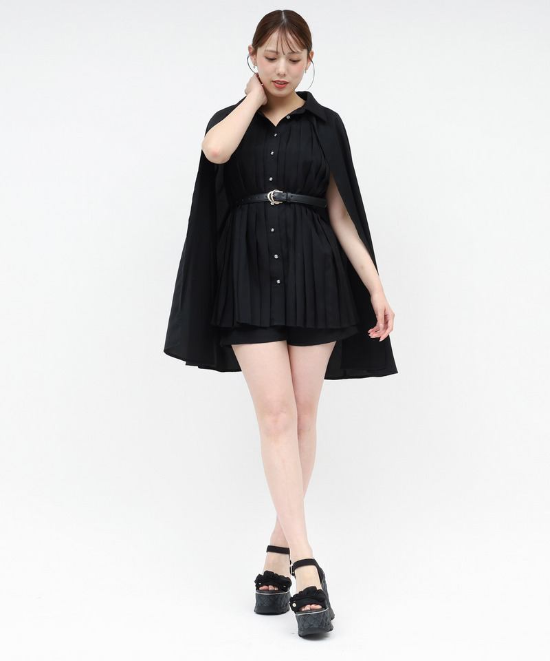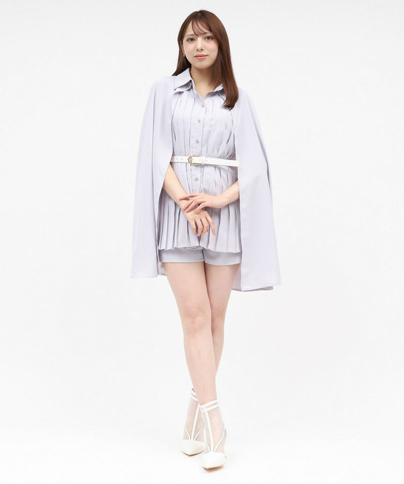 フロントに施されたタックデザインやキラリと輝くビジュー釦が魅力のケープ付ブラウス×同素材ショートパンツのセットアップ。