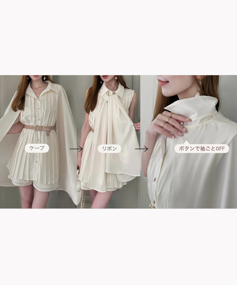 ケープ部分は取り外し可能となっており、シンプルにノースリーブブラウスとしてご着用いただいたり、ストール風にアレンジしたりとお好みに合わせて雰囲気を変えてお楽しみいただけます。